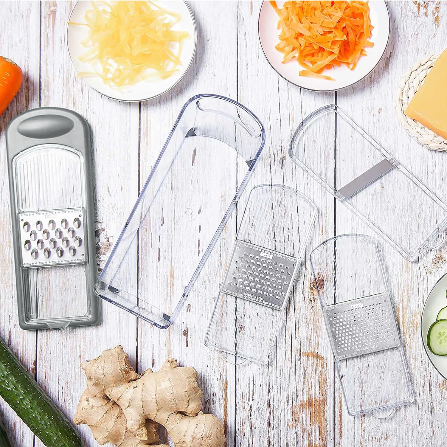 - VISUALIZATION - Transparent original design, 360° visualization of cutting cheese, fruit and vegetable into scrap, the mandolin is a good helper on the kitchen when you making pizza and salad.