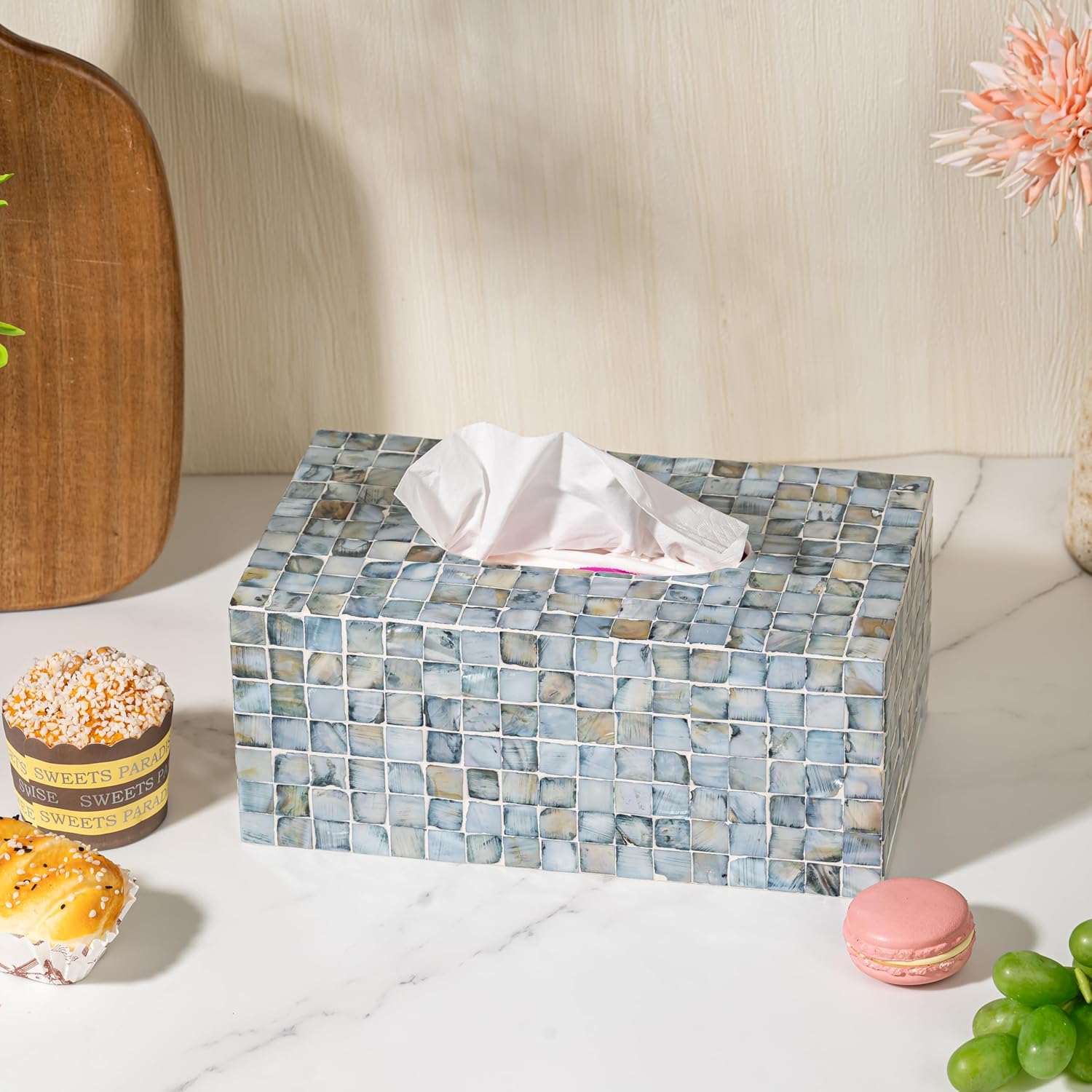 - [UNIQUE GIFT] This rectangular tissue box cover holder with moth or pearl / capiz shell inlay is a perfect present for Holiday Season, New Year, Christmas Eve, Celebrations for natural lovers and minimalists, an ideal gift to express love and gratitude in special events. The mother of pearl decorative tissue box holder is a great rustic boho farmhouse centerpiece to any table, kitchen, party, coffee bar desk, dining room, bathroom, home, or restaurant.