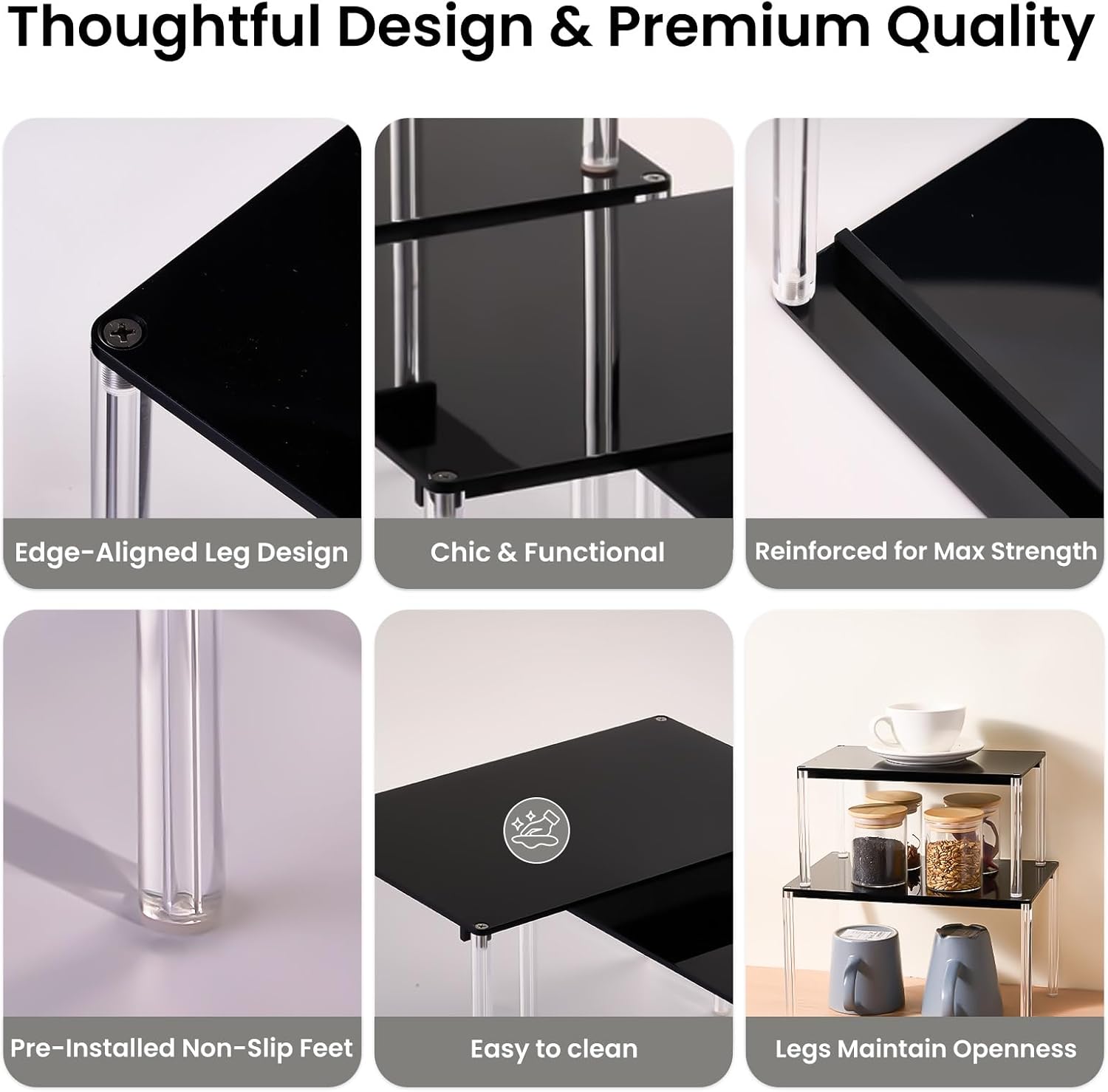 - Detailed & Safe by Design | Smooth & Non-Slip We focus on the details that matter. Every edge of this acrylic shelf riser is finely polished to be smooth and safe to the touch. For your convenience and to protect your surfaces, each leg comes with a pre-installed non-slip pad. This thoughtful feature saves you time and prevents scratches on your delicate countertops, whether it's a wooden desk or a bathroom vanity shelf, ensuring your furniture stays protected