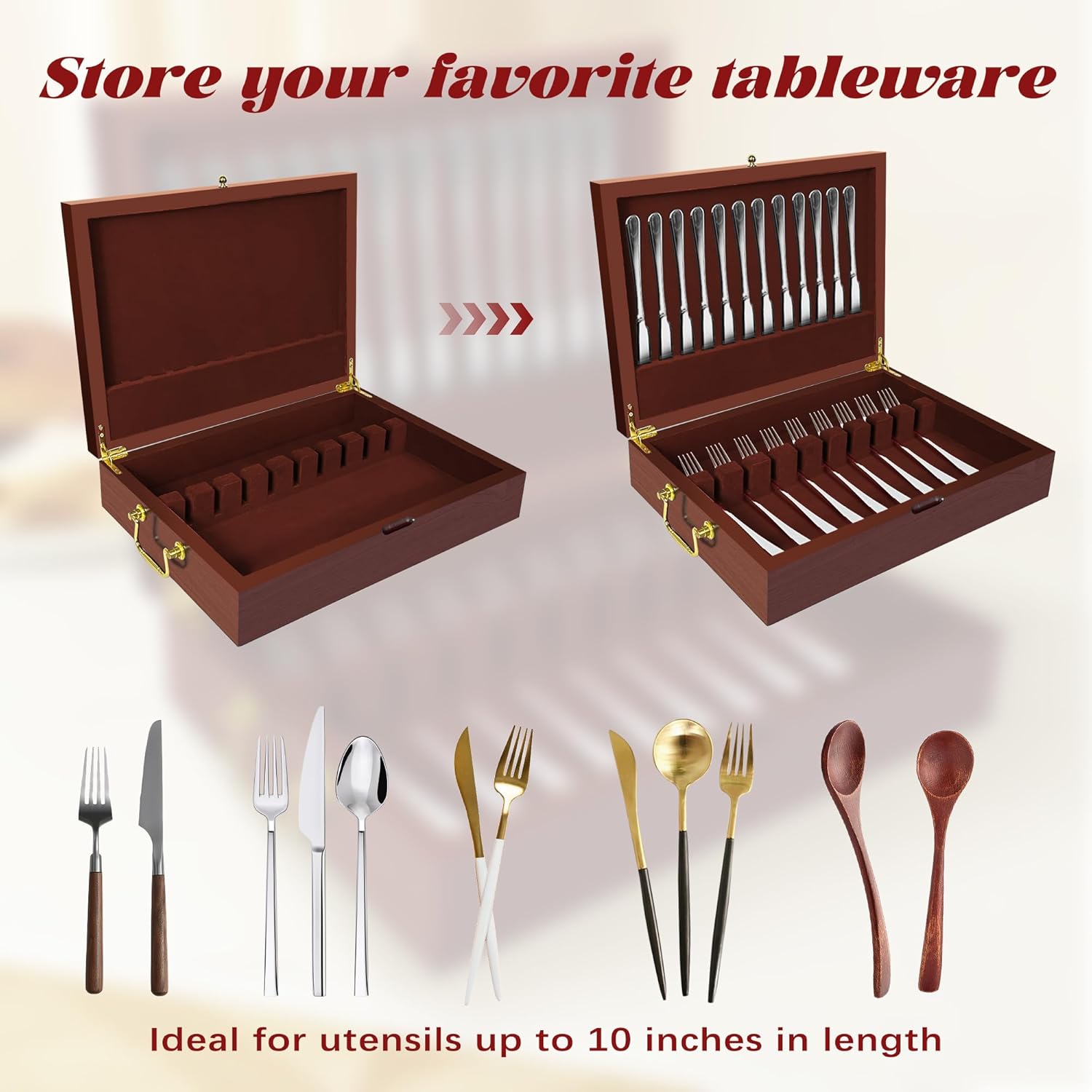 - 【Elegance Meets Functionality】Elevate your silverware storage with this beautifully crafted wooden box, designed to combine timeless elegance with practical functionality. Featuring a polished mahogany finish, a plush velvet interior, and an intelligent layout, this storage box keeps your flatware organized, protected, and ready for any occasion. (Note: Flatware not included.)