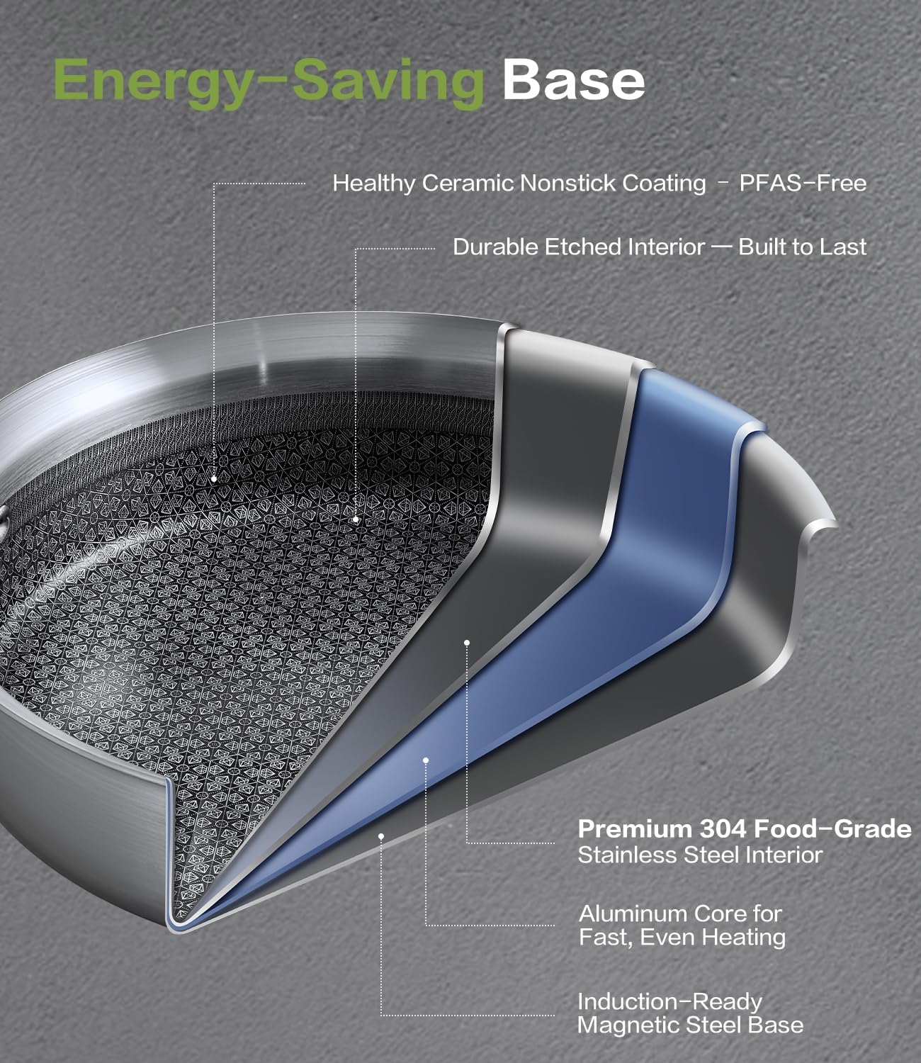 - ENERGY-SAVING BASE & INDUCTION COMPATIBLE :The ECO-EFFICIENT TRI-PLY BASE distributes heat evenly for faster cooking and less energy waste. Works perfectly on all stovetops, including INDUCTION, electric, and gas.