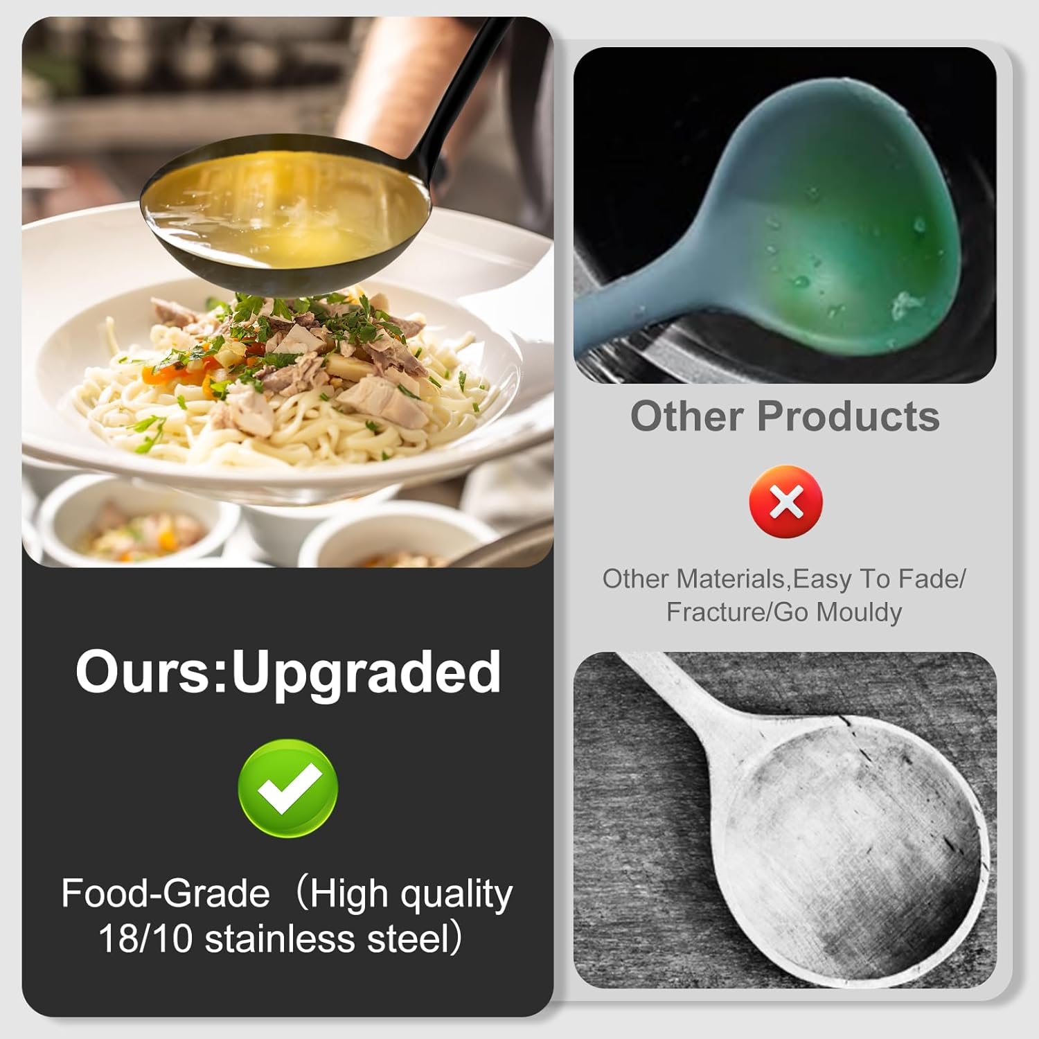 - š„ More Safe and Healthyļ¼ Crafted with food grade 18/10 stainless steel rustproof & corrosion-resistant material. The ladle ensuring years of reliable use in both home and professional kitchens. Its sleek, polished finish adds a touch of sophistication to any cooking or serving experience.