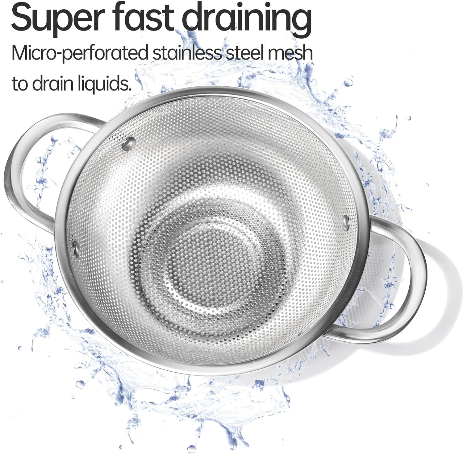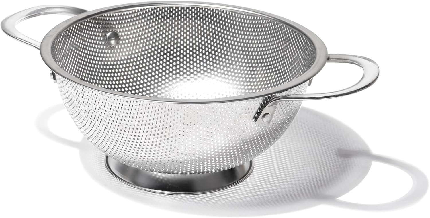 - 【Ultra-Fine Mesh Design for Efficient Draining】Features a precision-engineered micro-perforated stainless steel mesh to swiftly drain liquids while retaining small food particles. Perfect for pasta, vegetables, and delicate ingredients like quinoa or berries.