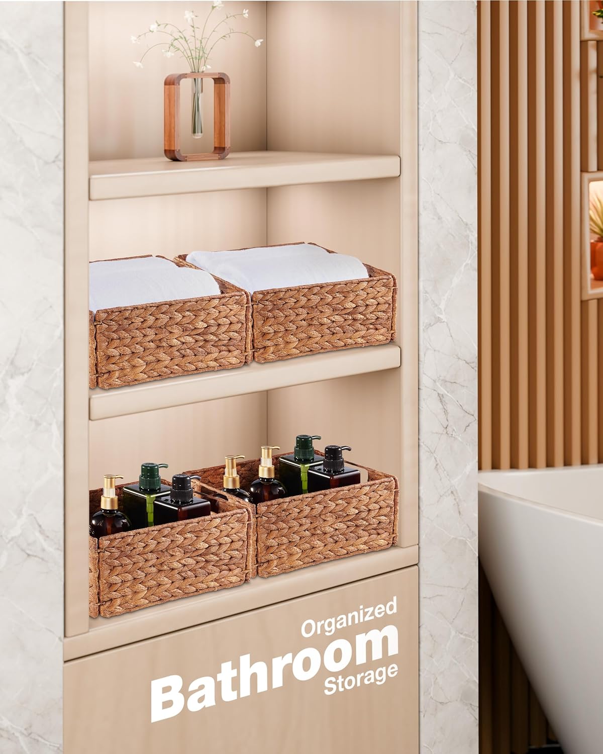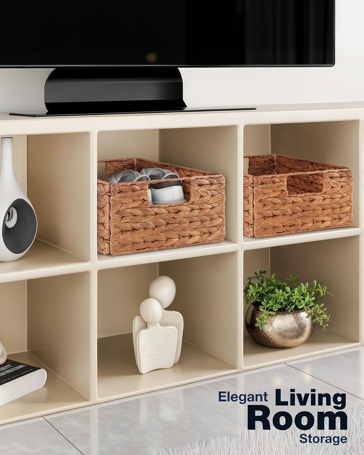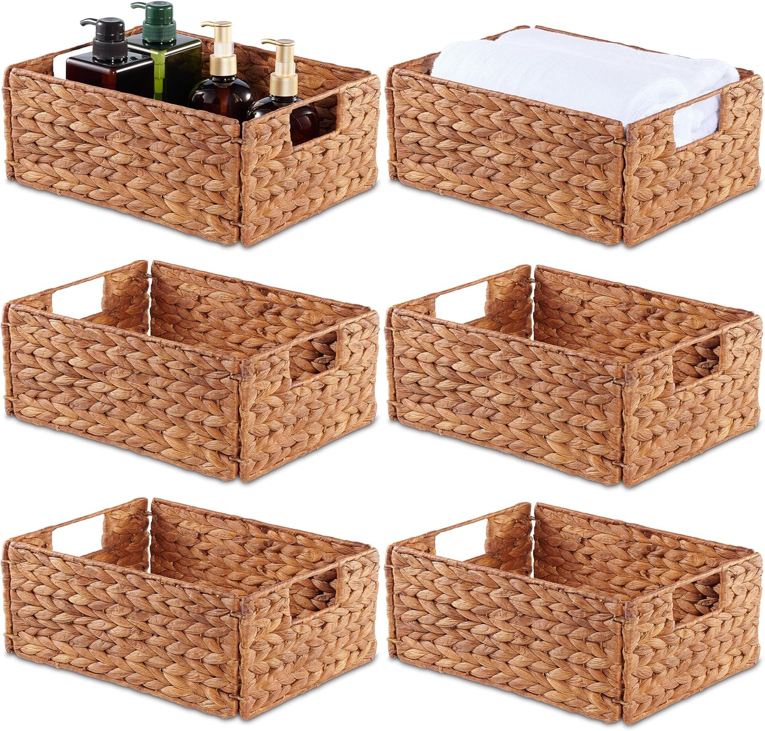 BLUEWEST Wicker Storage Baskets Pack 6, Woven Baskets for Storage, Laundry Water Hyacinth Basket for Organizing with Carrying Handles, Rattan Baskets (Brown, Rectangular)