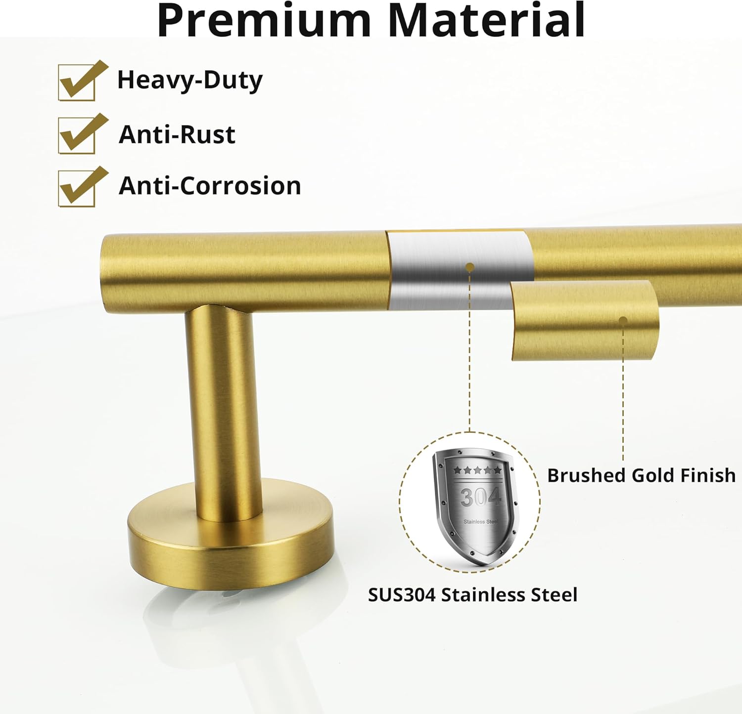 - Durable & Rustproof Material: Our towel bar for bathroom wall is made of quality 304 stainless steel, featuring excellent strength and durability. With a brushed gold finish, a durable material resists daily scratches and tarnish.