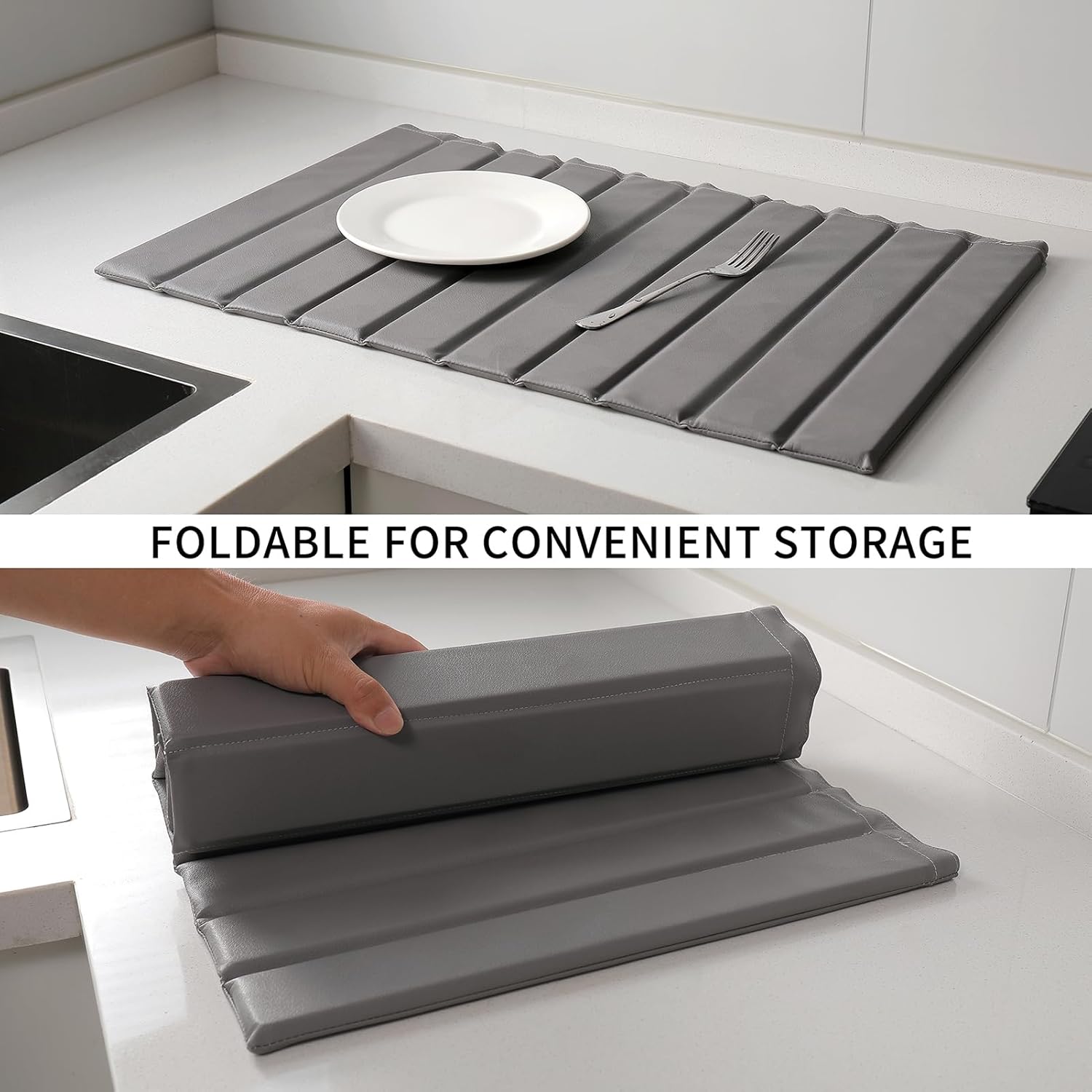 Stone Dish Drying Mat with PU Leather Surface for Kitchen Counter, Water-Absorbent Collapsible Roll up, Quick Dry, Non-Slip for Cups Dishes Bottles,Removable and washable(Medium Gray, 23.6”x15.4”)