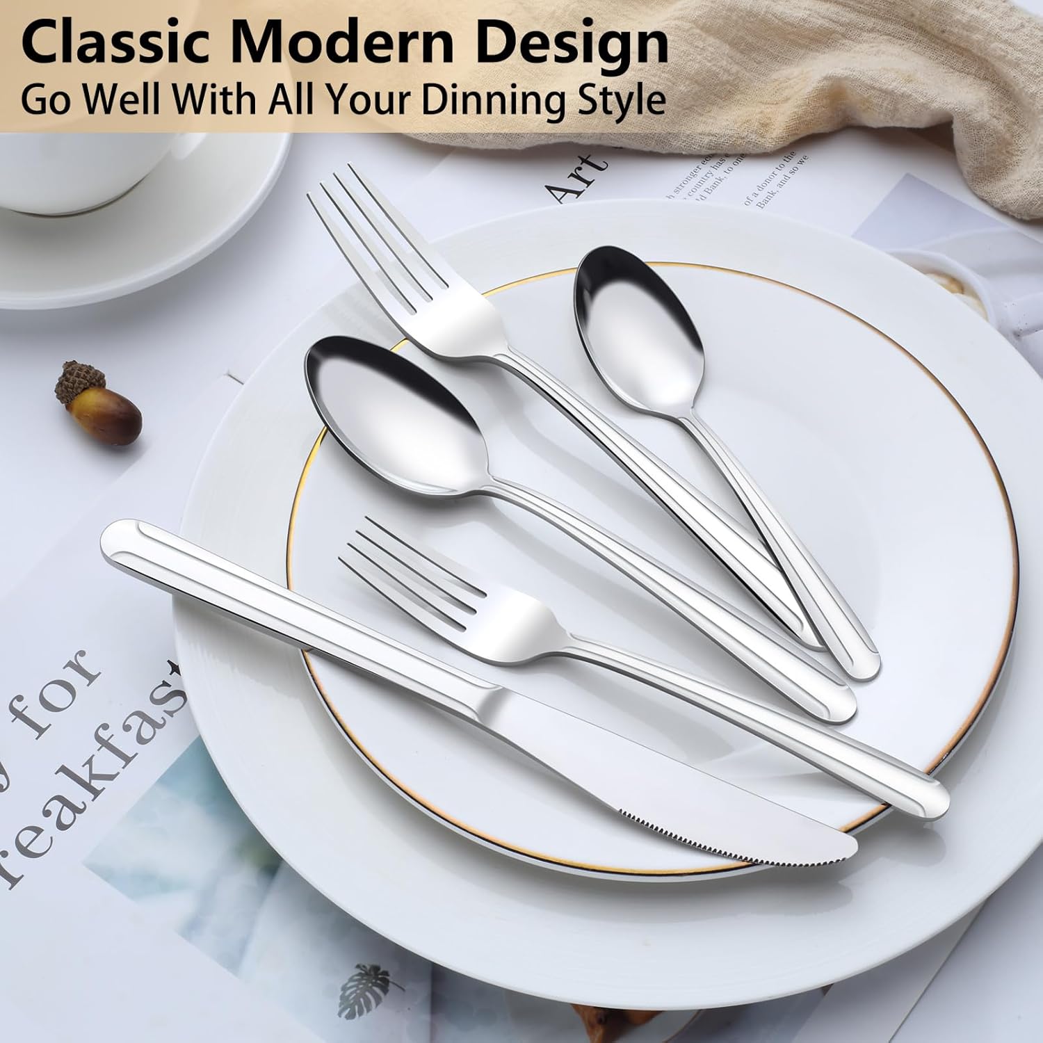 - 【Exquisite Workmanship and Mirror Polished】Our silverware set has highly polished makes the flatware set looks shiny and smooth edges that will not hurt your mouth while you using it. And our fork knife and spoon set design are simple, modern and elegant, with graceful line, perfectly shaped and sized, which have a classic design allows for mix and match with your existing flatware to elevate everyday meals into a fine dining experience