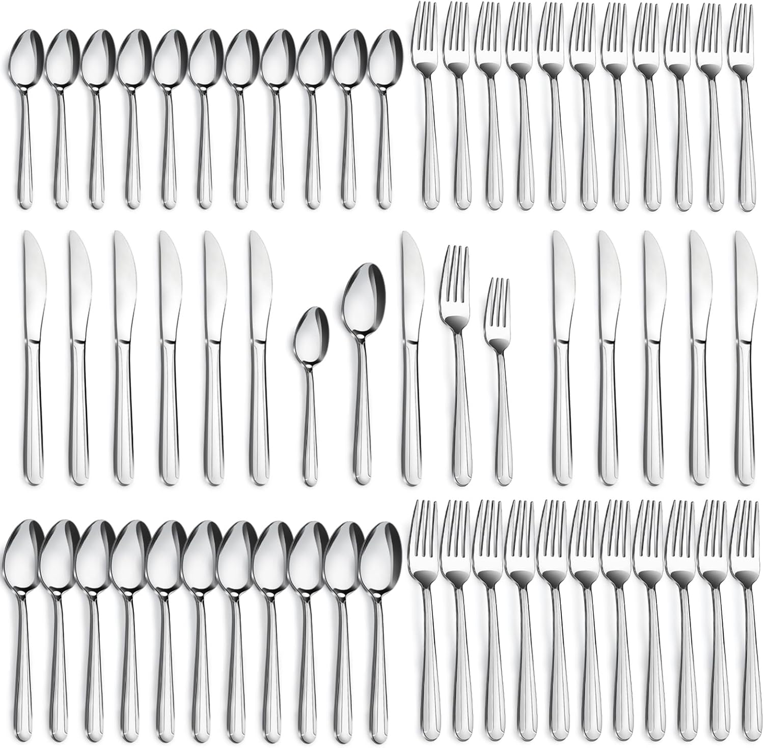 - 【60-Pieces Flatware Set For 12】Our 60 pieces silverware set contains 12 dinner spoons, 12 teaspoons, 12 dinner forks, 12 salad forks, 12 dinner knives, which is suitable for family use and reserve for important event occasions