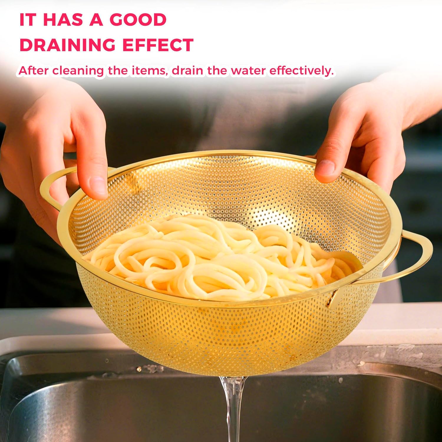 Snailhouse Colander, 3 Quart Kitchen Stainless Steel Metal Pasta Rice Food Colander Strainer Bowl with Handles and Legs for Draining Washing, Gold
