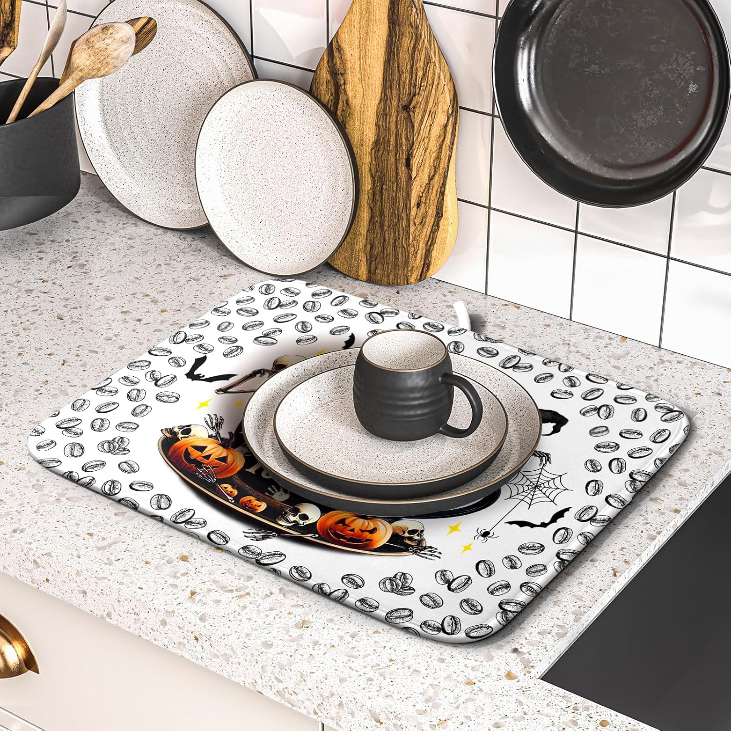 Funny Skull Coffee Matt for Counter Skeleton Dish Drying Mat Halloween Decoration for Home Coffee Bar