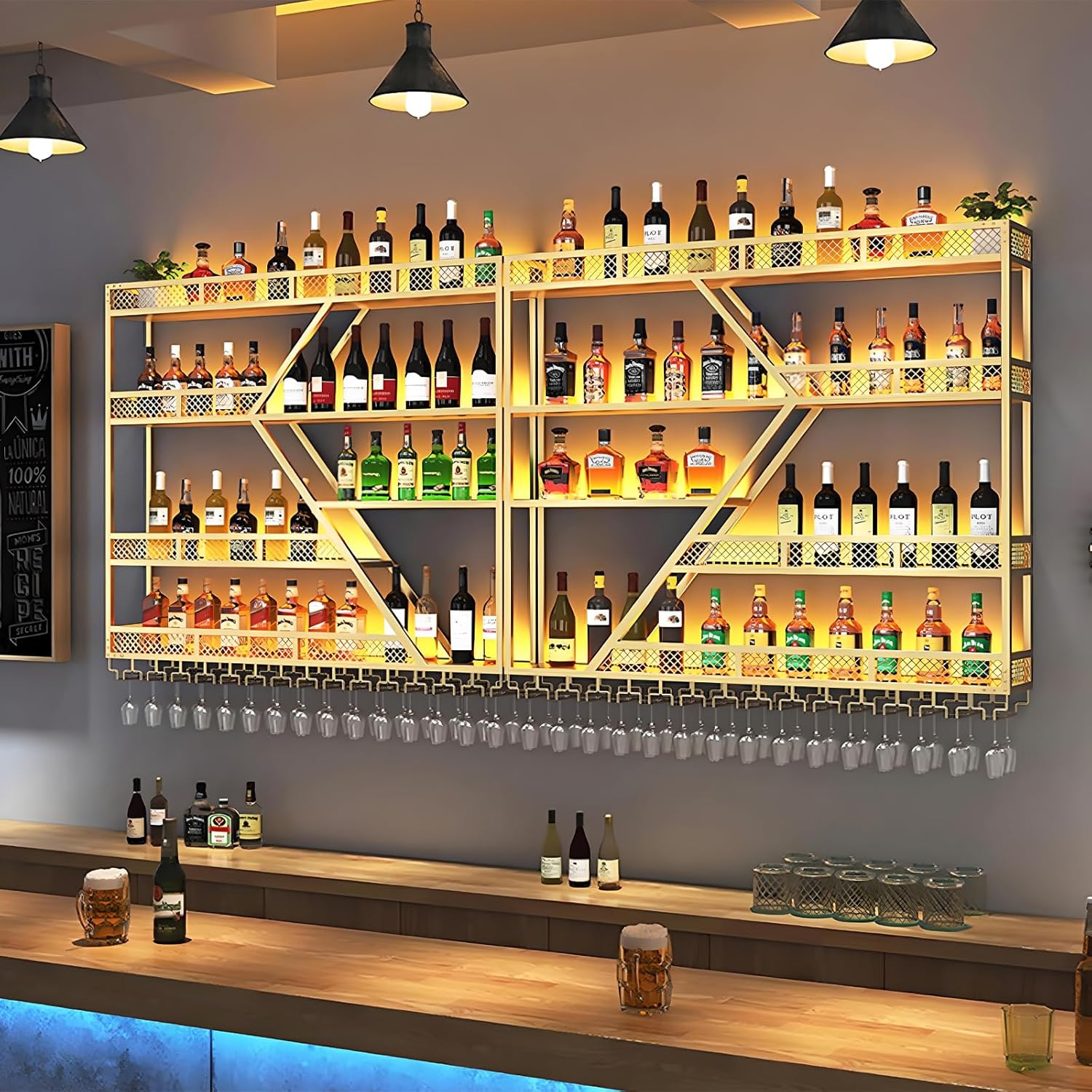 79in Metal Wine Rack Wall Mounted, Modern Wine Storage Rack Wall Mounted with Wine Glass Holder, Liquor Shelf, Bar Shelves for Liquor Bottles (4 Tiers Gold, 79 * 7.87 * 48.5INCH)