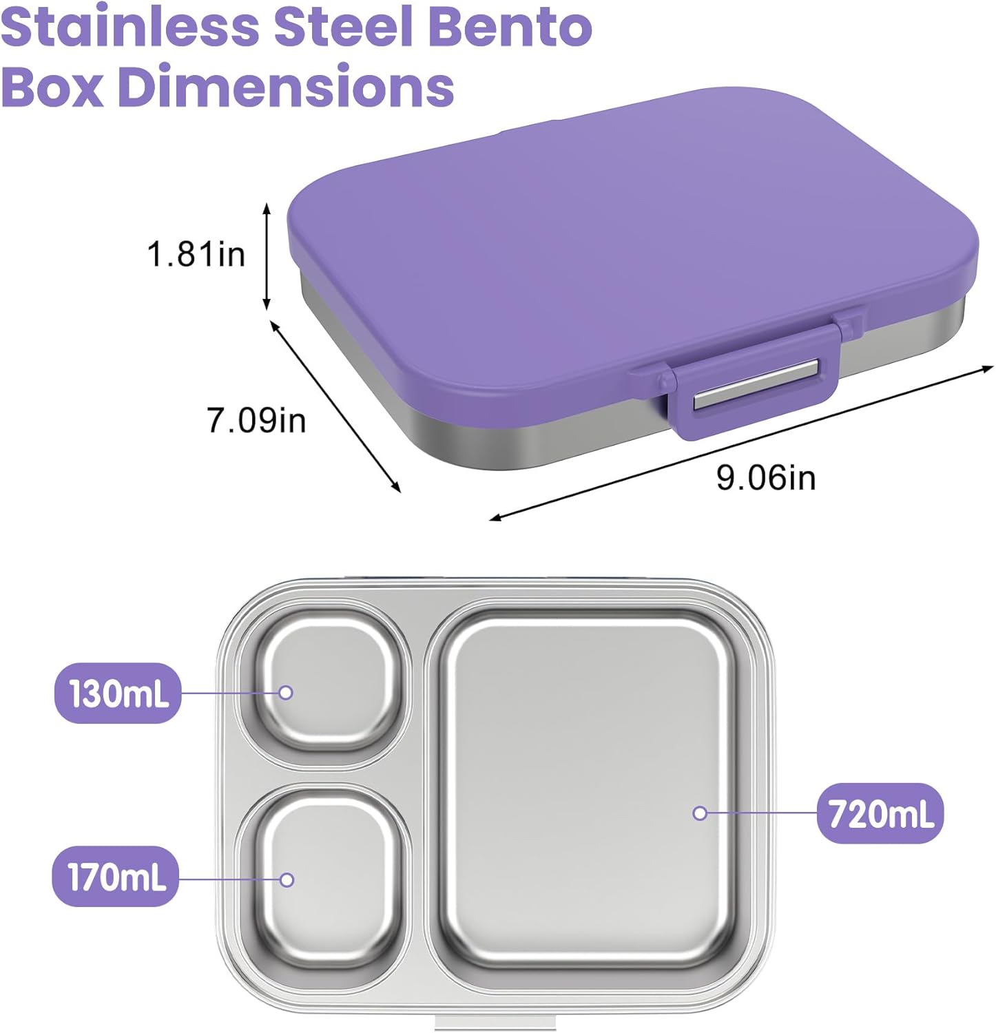 Stainless Steel Bento Lunch Box for Kids | 3-Compartment Lunch Box Container Kids | 100% Leakproof, Dishwasher-Safe, Eco-Friendly, Perfect Portion Control for Kids&Adult Healthy Meals (Purple)