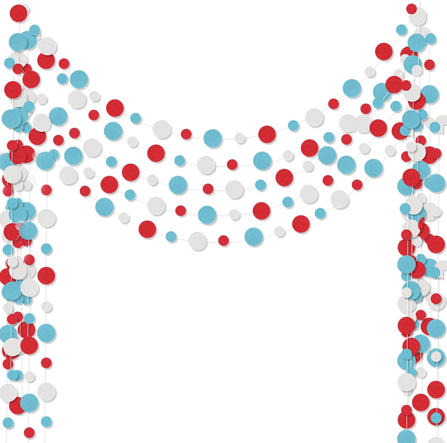 Outus 5 Pieces Colorful Dots Paper Garland Round Glitter Garland Hanging Confetti Streamers Backdrop Decoration for Birthday Classroom Candy Sprinkles Trunk or Treat Party (Light Blue,White,Red)
