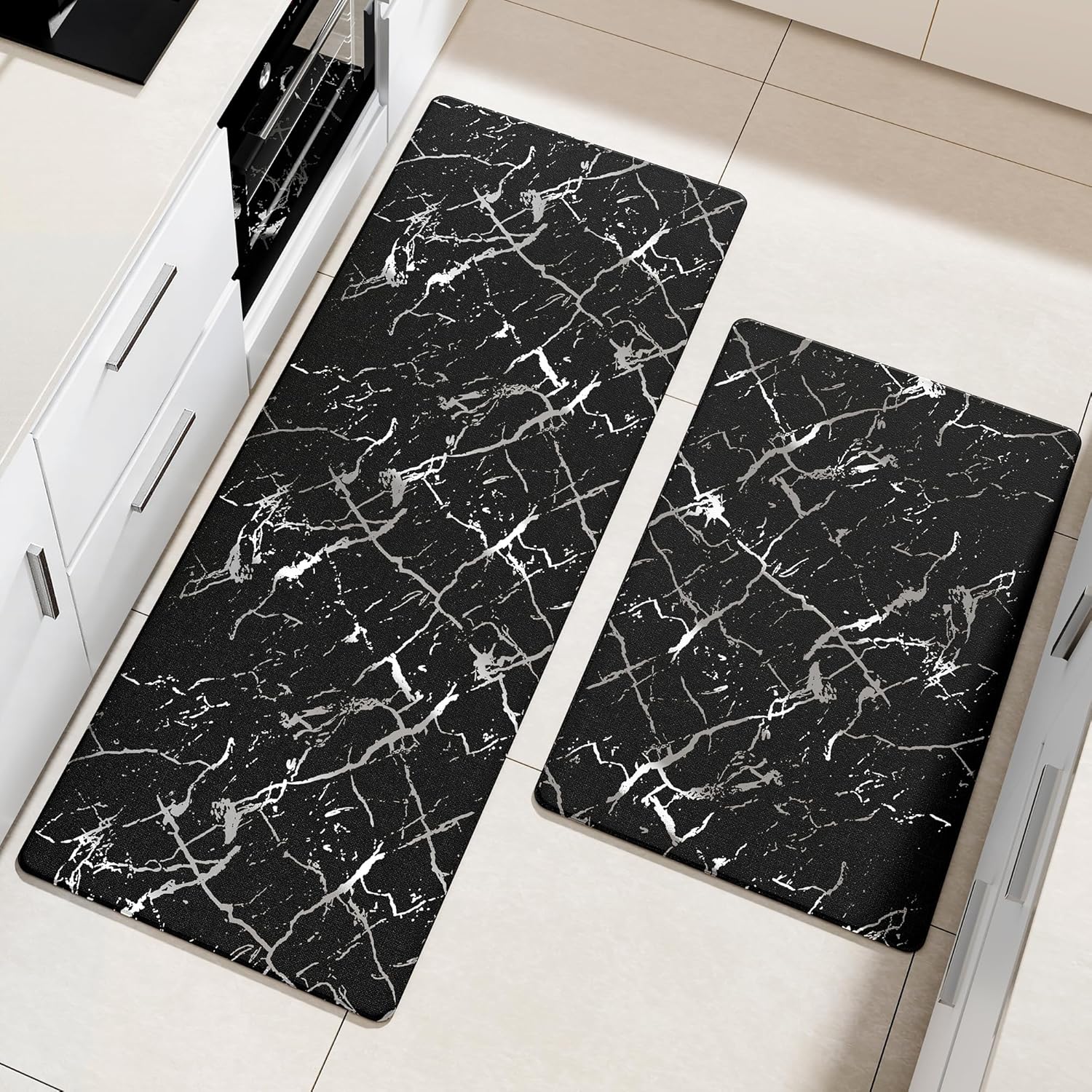 Silver Foil Stamped Marble Kitchen Mats for Floor 2PCS Cushioned Anti Fatigue Non Slip Waterproof Comfort Leather Kitchen Rugs 2/5 Inch PVC Kitchen Mats for Sink, Laundry, 17.3"x28"+17.3"x59", Black