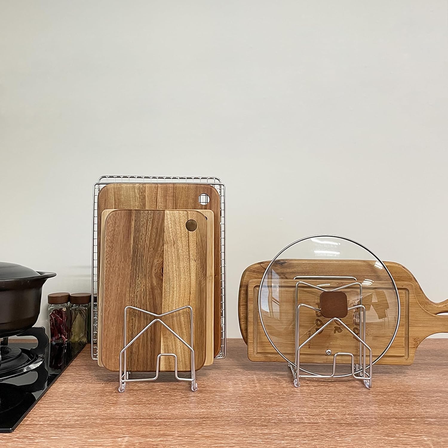 - VERSATILE FITS ANYWHERE: this cutting board organizer works great as lid organizers inside cabinet, or pots and pans organizers under cabinet. It saves valuable countertop space in kitchen