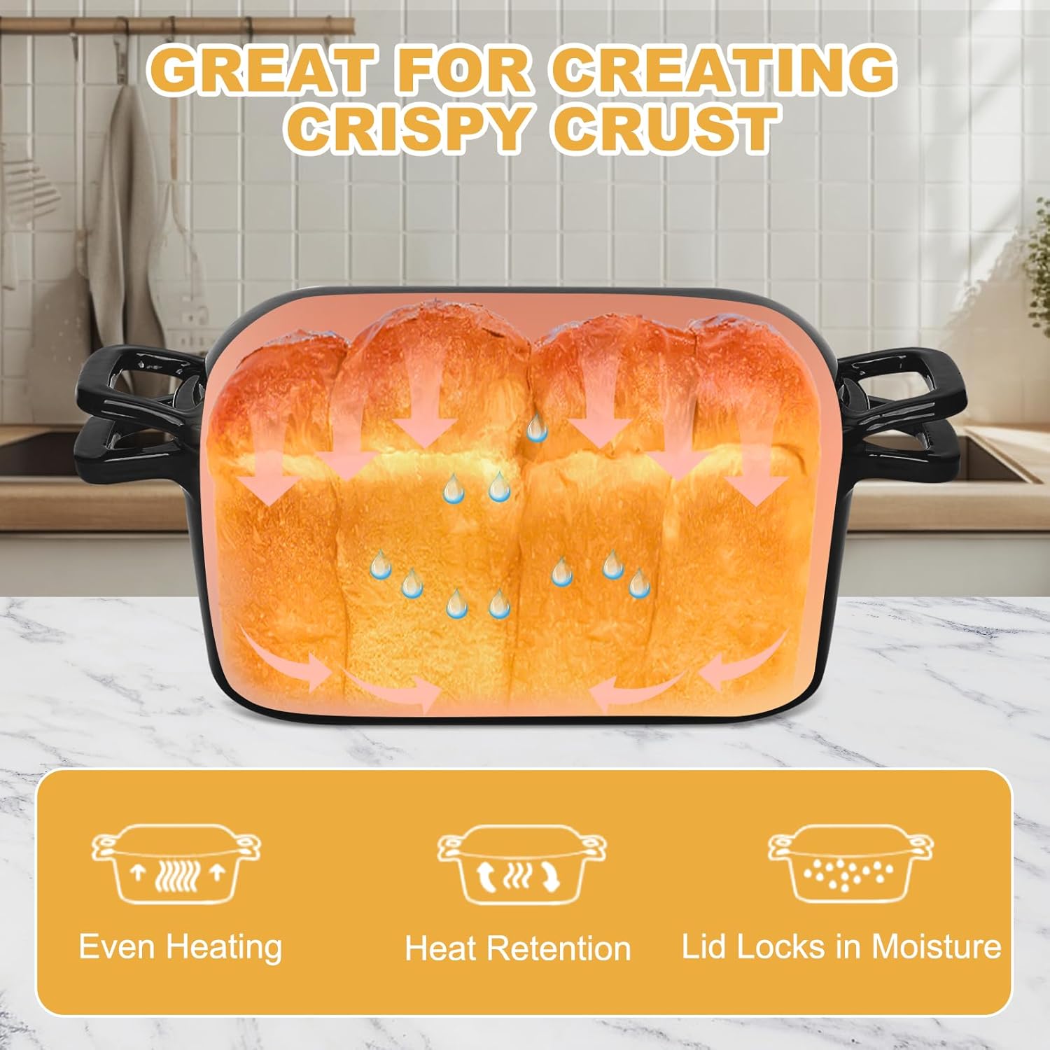 - Crispy Crust: The enameled cast iron dutch oven features a tight-fitting lid that traps steam, ensuring even heat distribution and retention for a perfectly crispy crust and soft interior in sourdough and homemade sandwich loaves