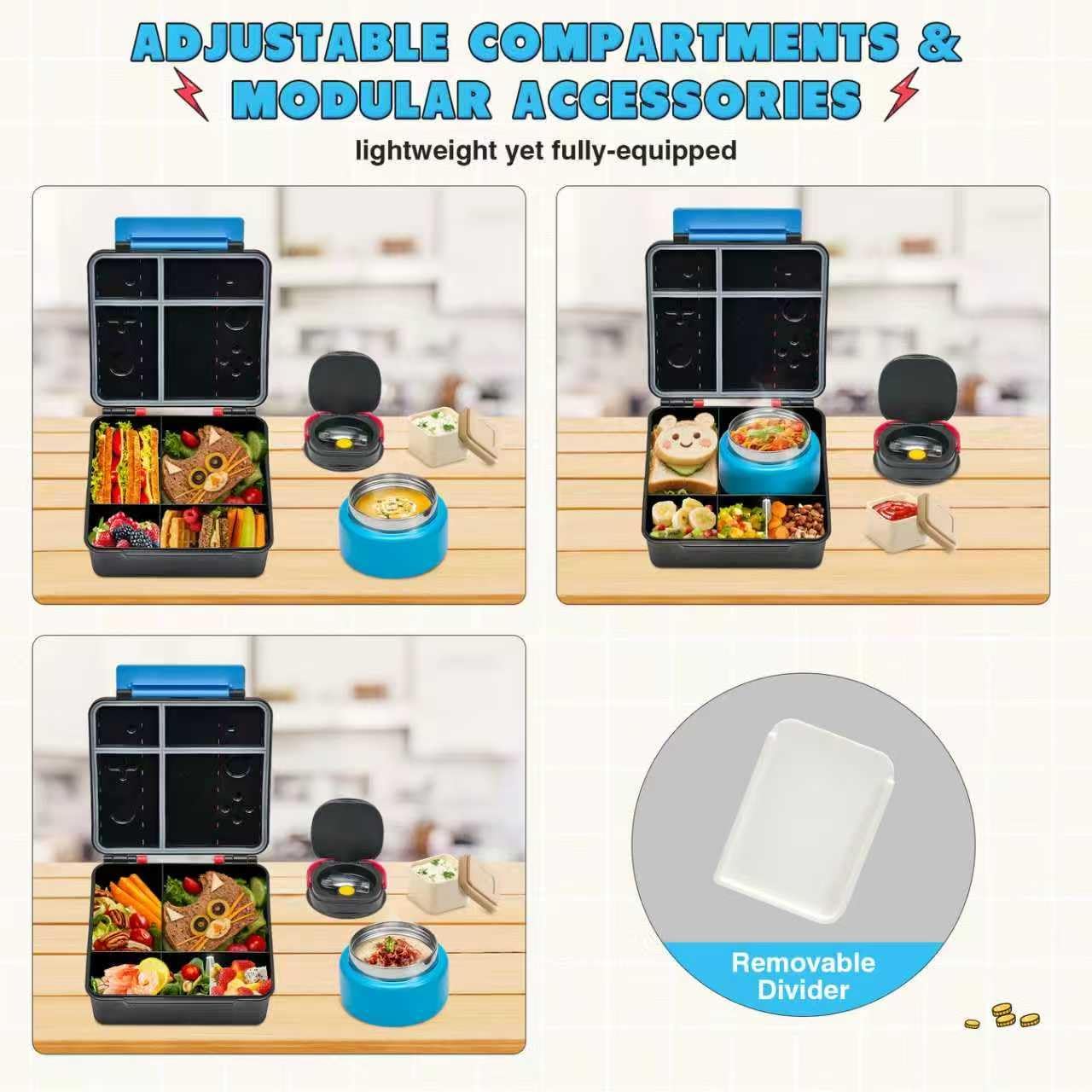 - Multi Compartment Design: Our lunch box have dividers and dip cups, and removable dividers allow you to customize the compartments for sandwiches, fruit, snacks, or regular meals. Individual sauce cups won't allow sauce to spill onto other foods and meals will be more flavorful! The perfect kids lunch box for school, traveling or picnics!
