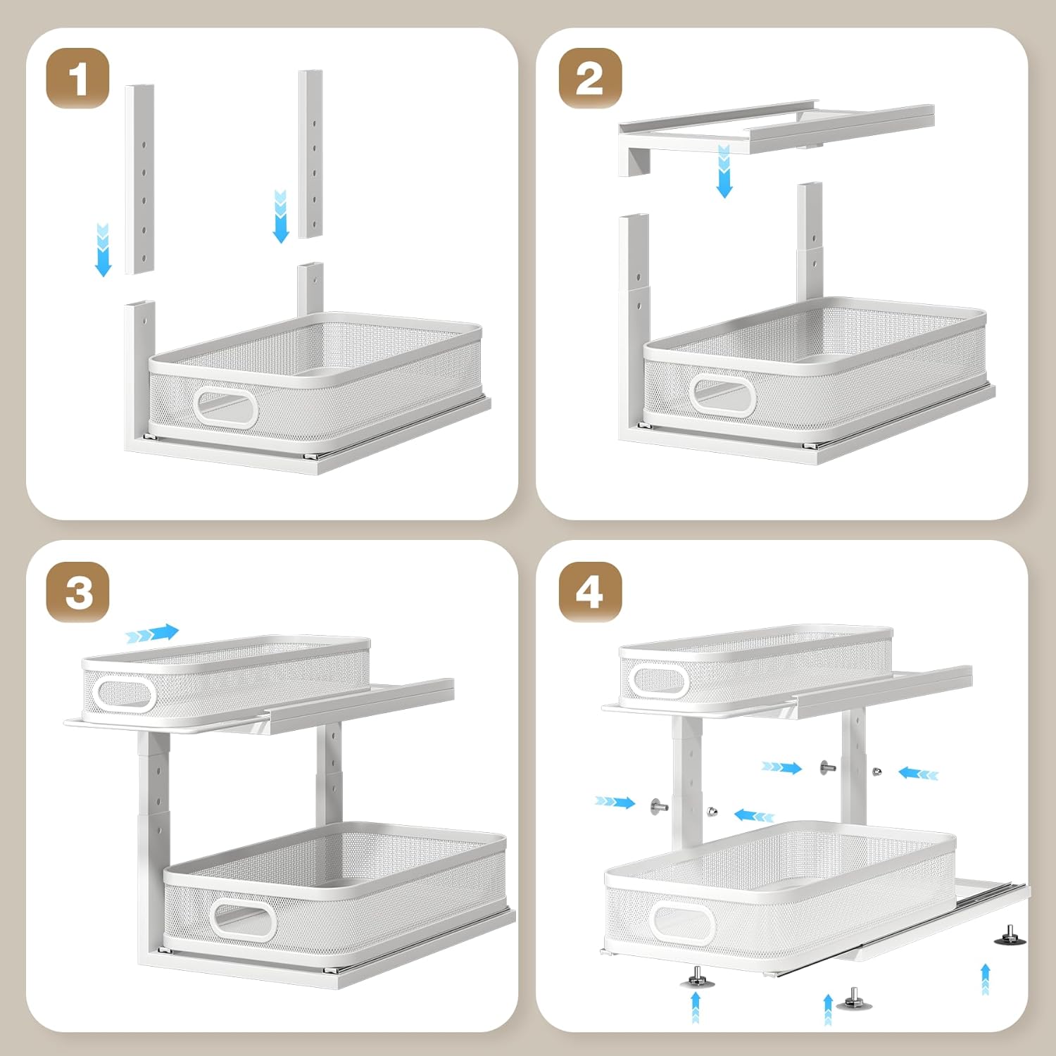 - 【2-Tier Pull Out,No More Strenuous Bending】Both upper and lower drawers glide out effortlessly, with no noise or jamming, giving easy access to items at the back of your cabinet without crouching or digging through clutter. Built-in stoppers prevent over-pulling, while suction cups at the base enhance stability for worry-free use.