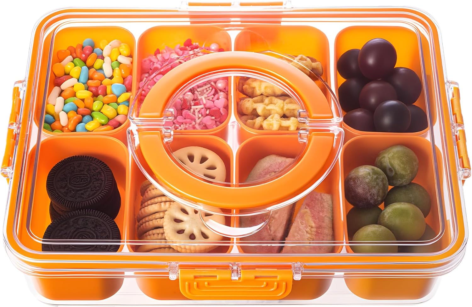 Divided Serving Tray with Lid and Handle - Snackle Box Charcuterie Container for Portable Snack Platters Organizer for Candy, Fruits, Nuts, Snacks - Perfect for Party, Entertaining, Orange