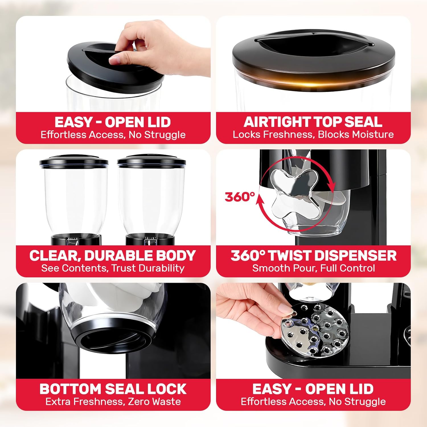 - Stylish Kitchen Essential. Sleek transparent body with a matte black base, cereal dispenser matching modern, Nordic, or Japanese kitchen styles—both a storage tool and a tabletop decor piece.