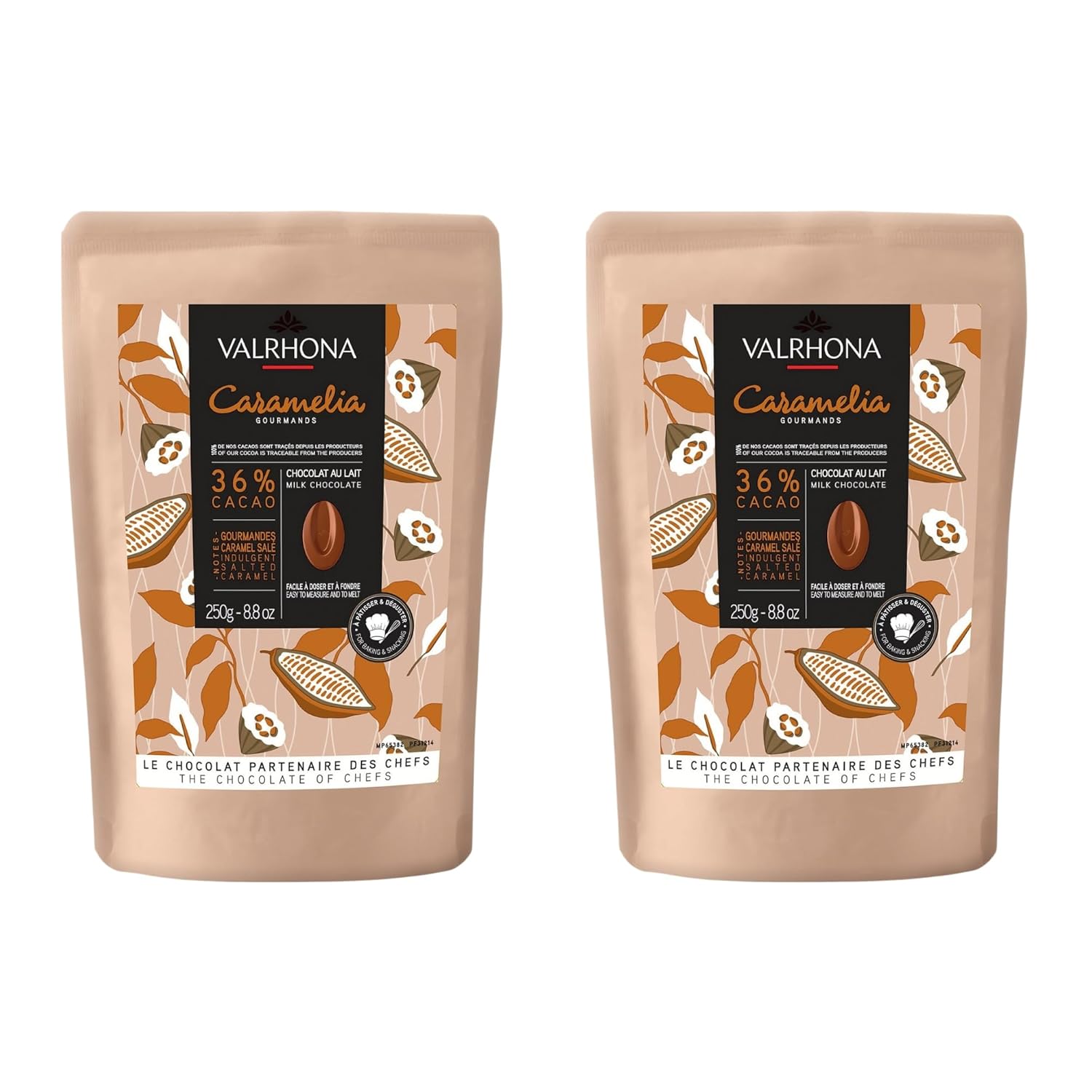 Valrhona Premium French Baking Milk Chocolate Discs (Feves). CARAMELIA 36% Cacao. Creamy, Caramel, Salted Butter Notes. Easy Melt-Tempering. Milky, Balanced. Luscious Frosting, Sauces 250g (Pack of 2)