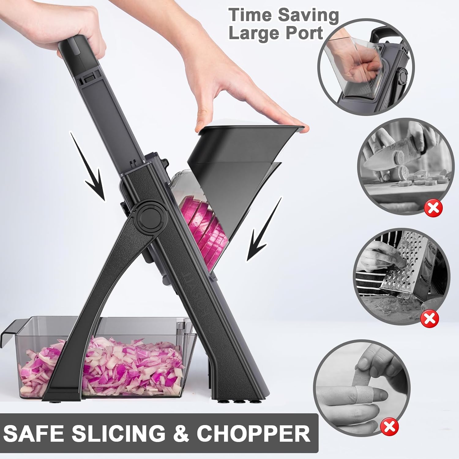 - ✅SAFER: This mandoline food slicer's built-in blades design prevents your hands from being cut. You can easily and safely process vegetables chopper and fruits slicer. updateded larger capacity and diameter, make chopping vegetable food easier and faster than a typical mandolin, recommend for a newbie in cooking, old person, child etc.