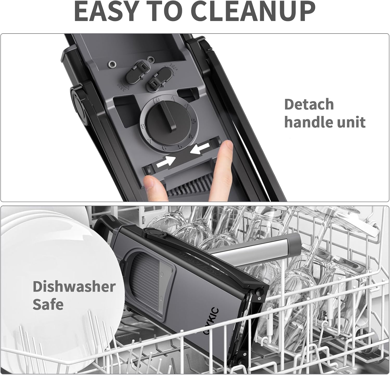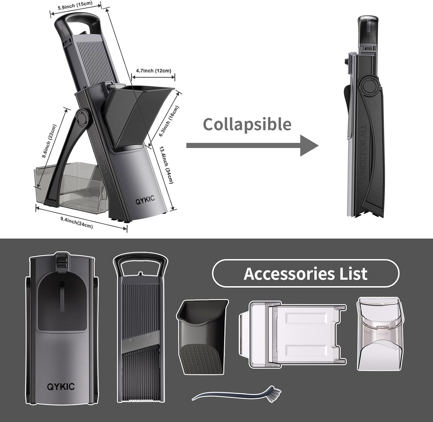 - ✅MULTIFUNCTIONAL : QYKIC vegetable chopper With 35+ slicing options, the mandoline slicer cuts perfectly-even slices from 0.5-8mm in thickness while also offering julienne, matchstick and dicing options. suitable for cutting potatoes, garlic, onions, carrots, onions, cucumbers, eggs, vegetables and fruits. tips: please do not cut meat.