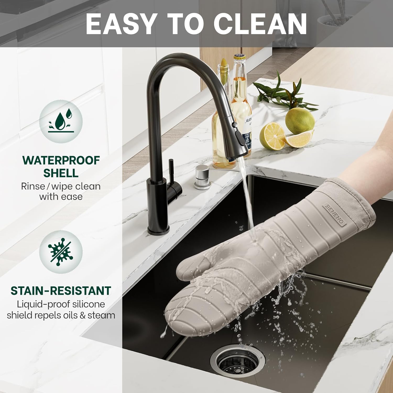Beneno Oven Mitts, Heat Resistant BPA-Free Soft Silicone Oven Mitts 2-Pack, Waterproof Non-Slip Flexible Oven Gloves with Comfort Cotton Lining, Durable Kitchen Mitt Set for Baking Grill, 7"x13" Beige