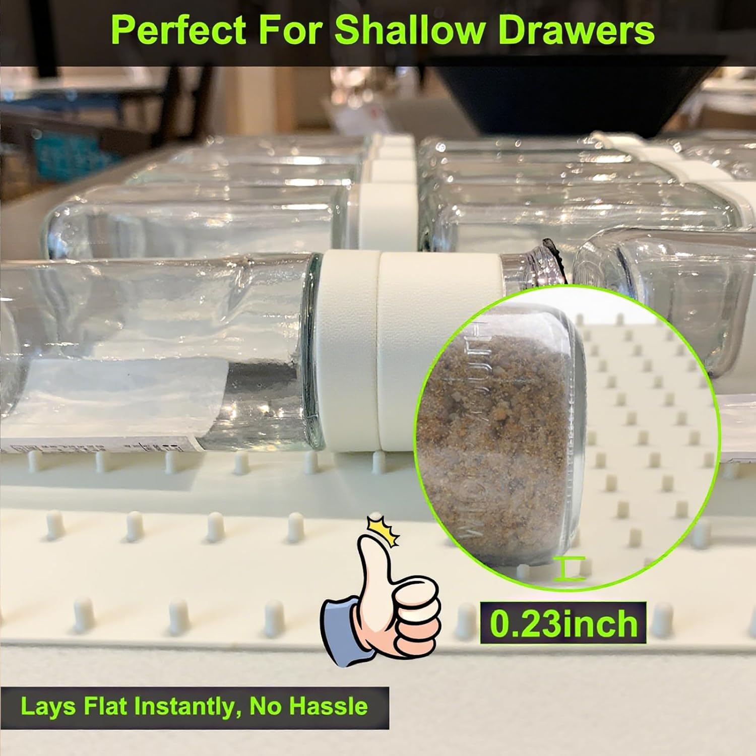 - 【Perfect For Shallow Drawers】Bottles lying flat on spice drawer liner, your spice drawer will fit square, around, tall and small, lager bottles better than others trays. the spice drawer organizer insert only 0.23 lnch height is much better fit any drawer, great alternatives if your drawer is shallow.