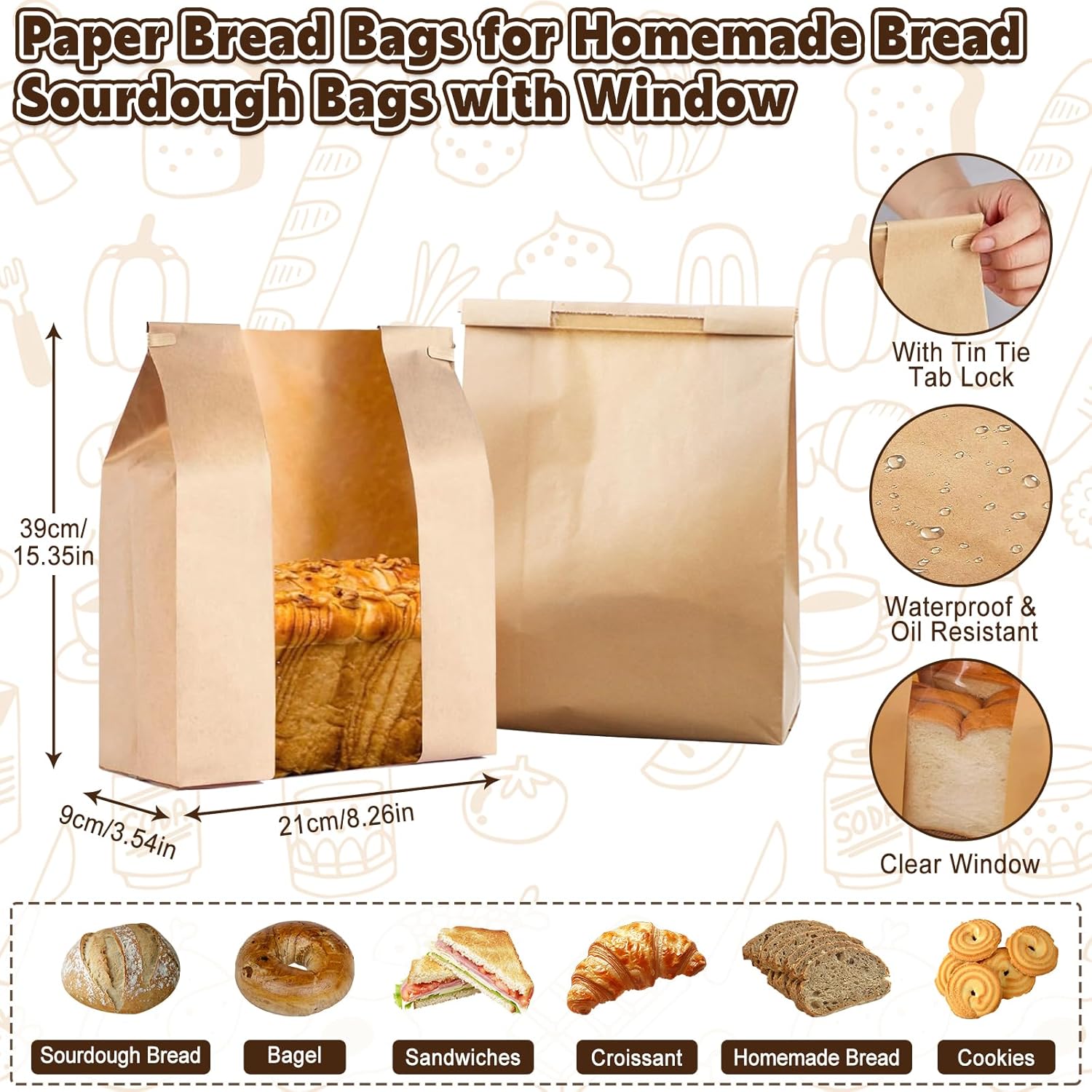 - Paper Bread Bags: Equipped with 10 large bread bags made of kraft paper, waterproof, oil-proof. The bread bag with tin tie tab lock , which can be easily opened or closed, no need additional ties or machine to seal it. Built-in transparent window allows you to easily see the delicious dishes inside. Very suitable for packaging various baked goods and snacks