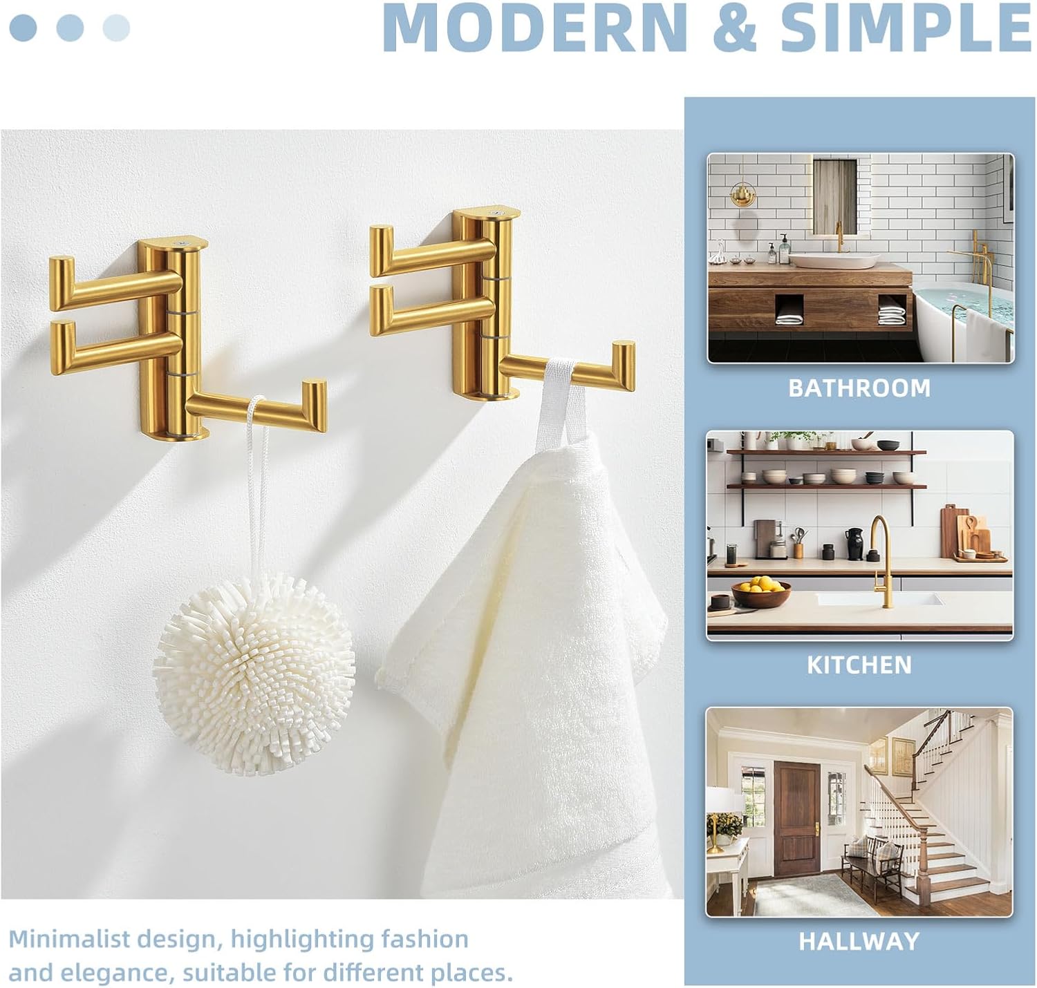 Suyar Bathroom Towel Hook Brushed Gold, SUS 304 Stainless Steel Swivel Coat Robe Holder 3 Foldable Arms, Rotating Wall Hook, 2 Pack