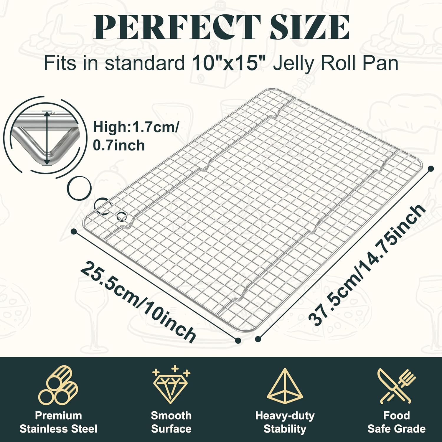 - PERFECT FITS HALF SHEET SIZE: Our cooling racks for baking measures 14.75 x 10 x 0.7 inches and is designed to perfectly fit a large 10x15 inch jolly roll sheet baking pan (baking pan not included). The 6 support feet provide better air circulation, making your baking process more efficient, easy, and enjoyable