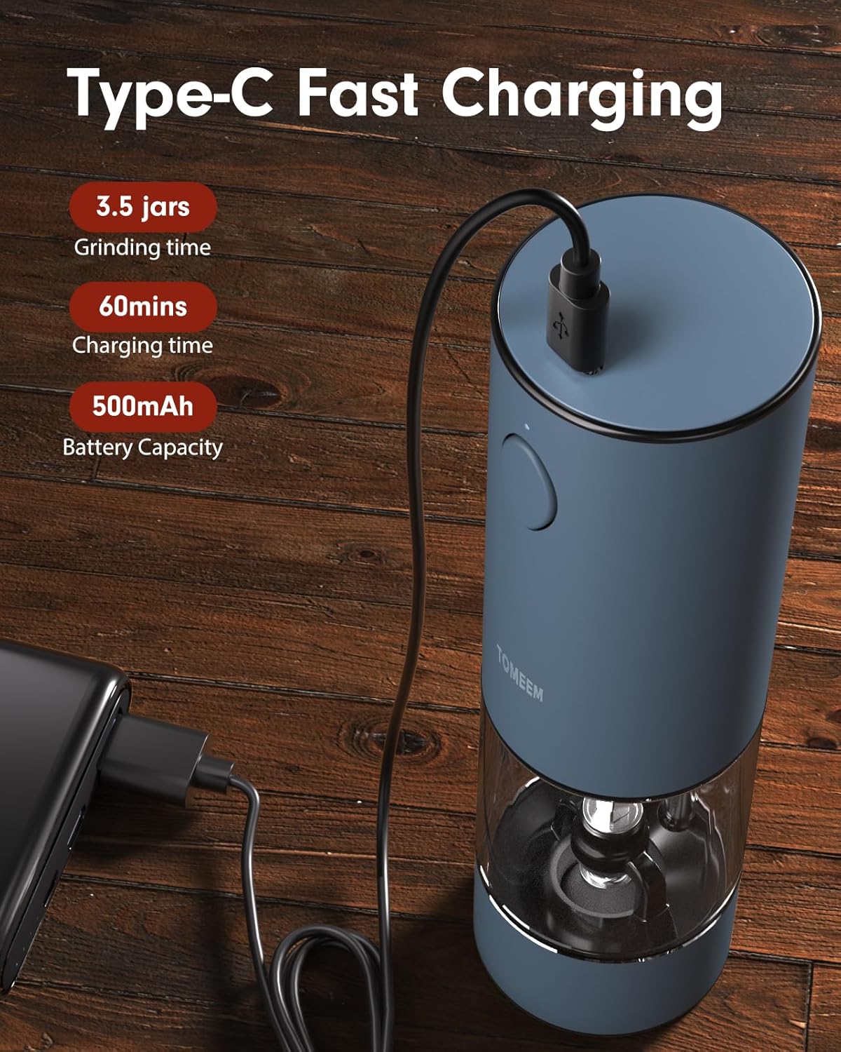 - Rechargeable Design: TOMEEM rechargeable salt and pepper grinder set features a Type-C charging cable for quick and convenient charging. With just one charge, it can be used for daily purposes for approximately a month. Say goodbye to disposable batteries, save money