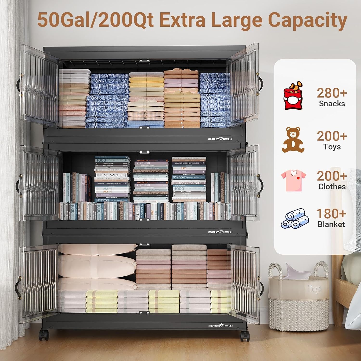 - 【Super Clear Magnetic Doors & 4x Wheeled】The large storage bins with clear PET doors provide two options: front doors opening or top lid opening. The clear PET door can be easily seen through and with a magnetic device. The 4x 360-degree rotating wheels all have fixed functions and can be easily moved by releasing the valve, making them friendly to the elderly.