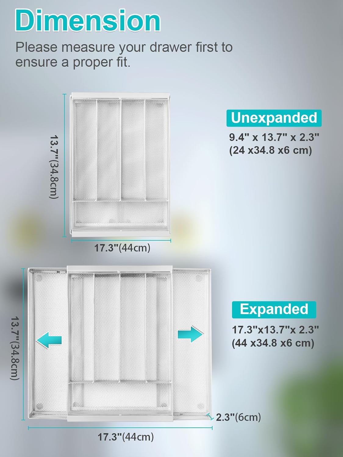 - Anti-Slip & Durable:Equipped with Non-slip Feet to Keep it in Place When Opening or Closing Drawers. The Mesh Panels fit Perfectly, Ensuring Utensils Stay Organized Without Getting Caught. The All-metal Frame Cutlery Organizer Adds Modern Style, Offers Excellent Load-Bearing Capacity, and Maintains Its Shape Under Pressure.