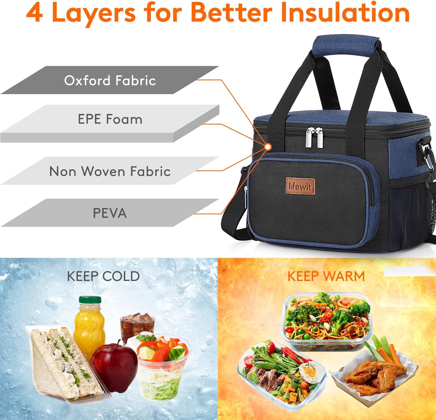 - Thermal Insulated: The lunch bag is made of insulated material which can keep food and drinks cool or warm for more than 5 hours. Besides, the interior lining is made of food grade PEVA foil so you can put your food into the bag directly without any worry. The built-in 6mm EPE foam provides great protection to your containers, food and drinks.