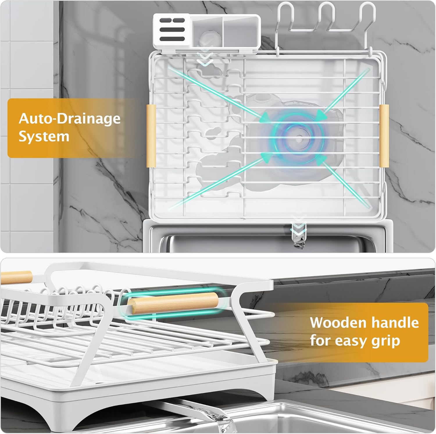 - AUTO-DRAINAGE SYSTEM: This dish rack comes with a cultery holder that has a large water drainage hole, as well as a big drip tray with four grooves.When damp items are placed on the sink caddy, the water flows down the sloped drip tray into the sink.