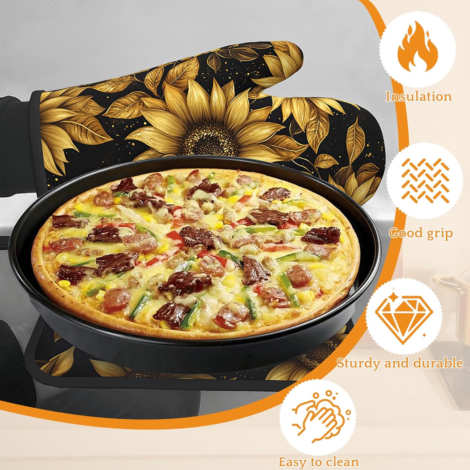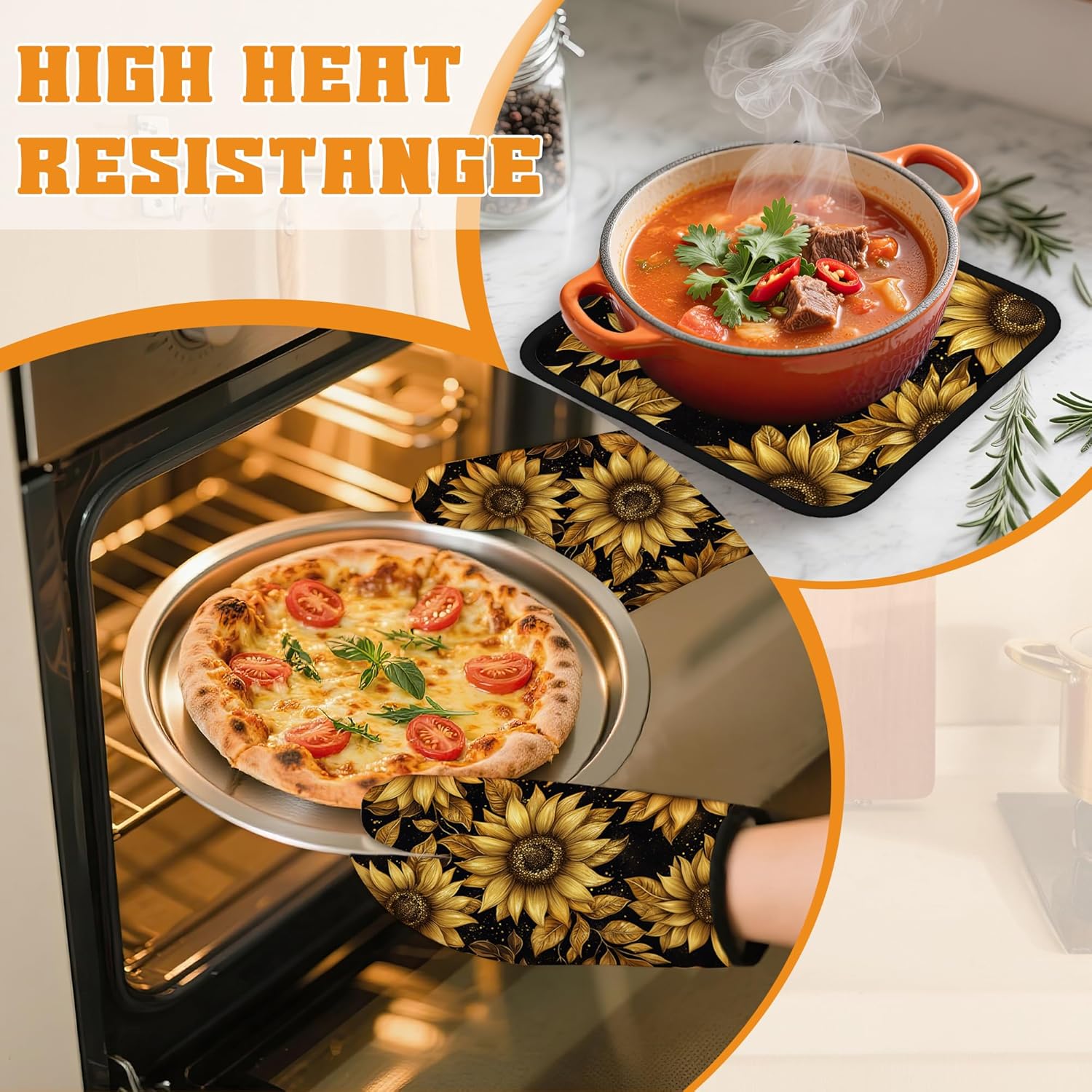 Vintage Sunflower Oven Mitts and Pot Holders,Sparkling Heat Resistant Oven Mitts Gloves and Pot Holder for Home Kitchen Decorations Cooking Baking BBQ Gifts,Set of 4