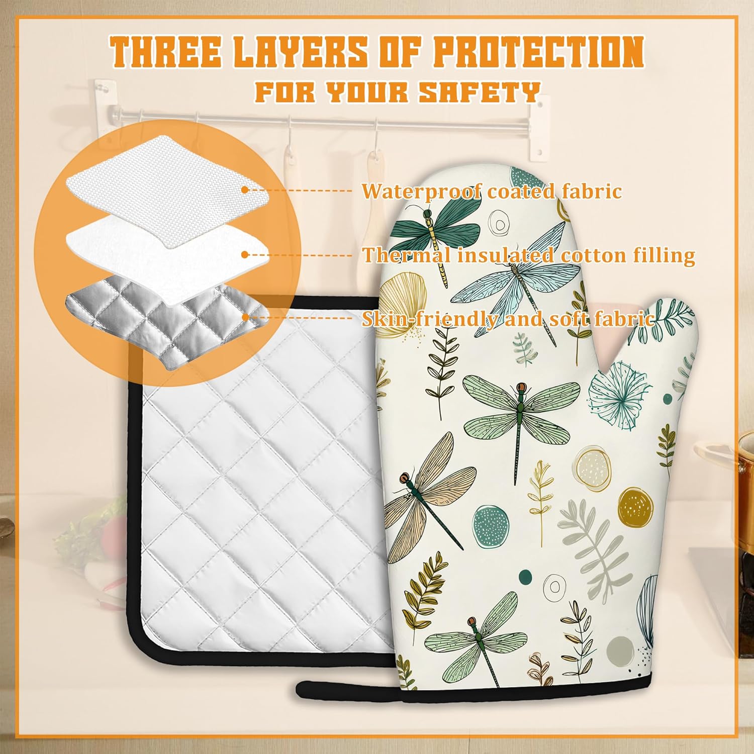 Vintage Dragonfly Oven Mitts and Pot Holders,Boho Heat Resistant Oven Mitts Gloves and Pot Holder for Home Kitchen Decorations Cooking Baking BBQ Gifts,Set of 4