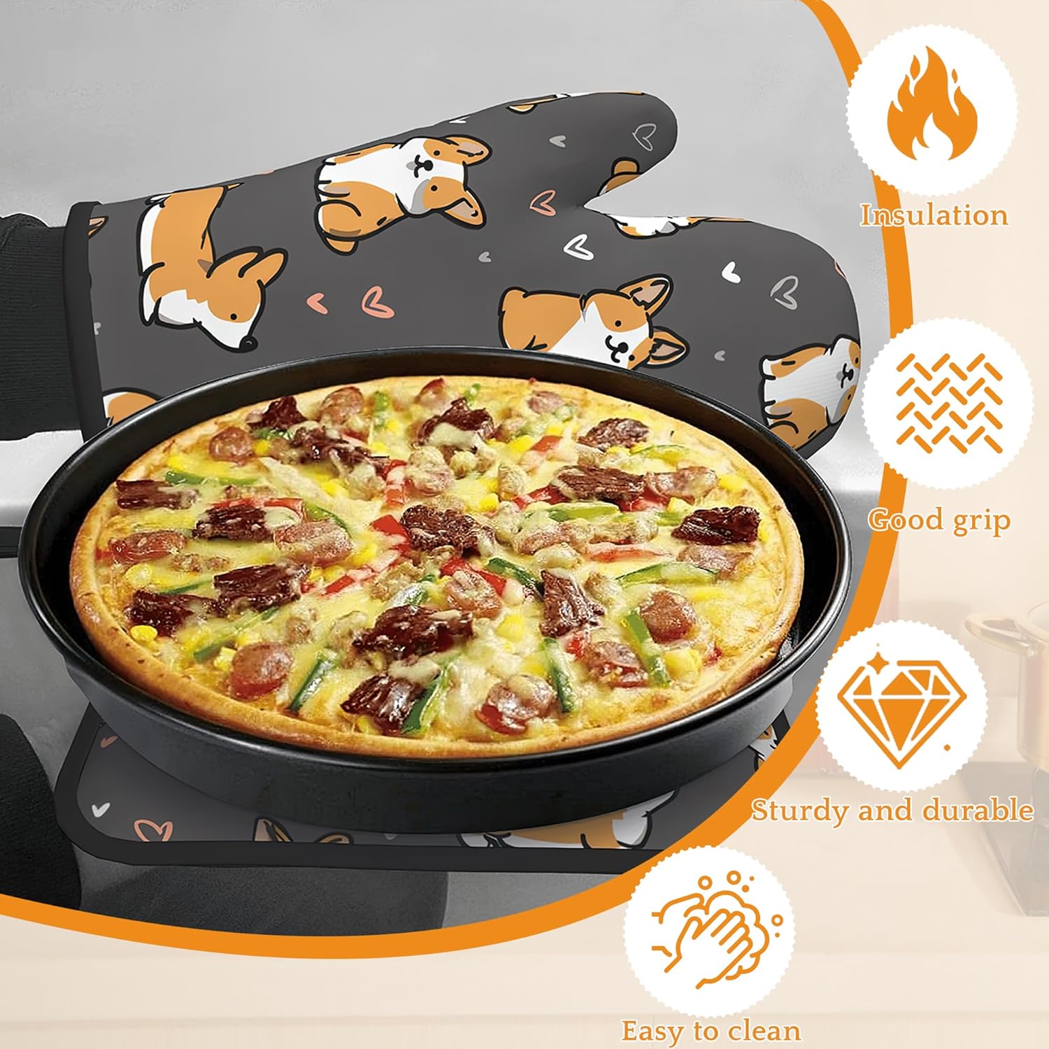 Cute Corgi Dog Oven Mitts and Pot Holders,Heat Resistant Oven Mitts Gloves and Pot Holder for Home Kitchen Decorations Cooking Baking BBQ Gifts,Set of 4