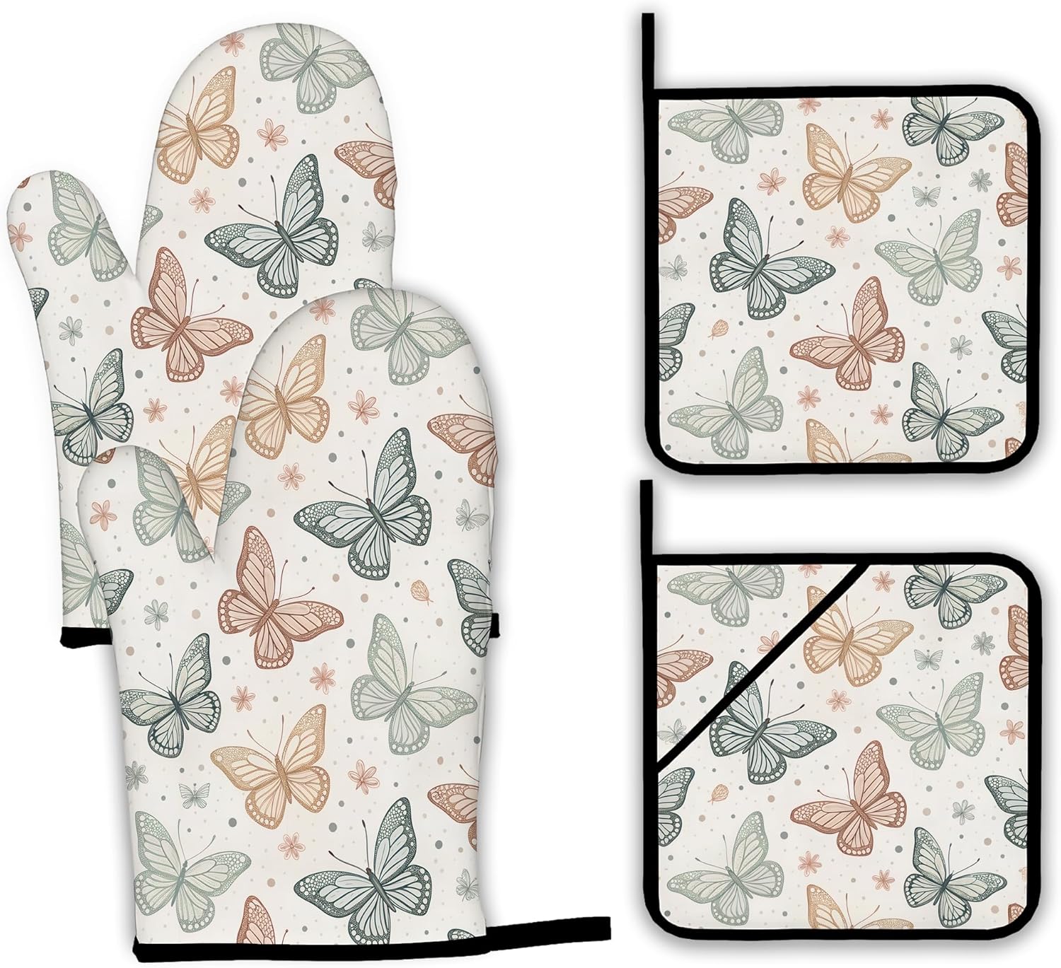 Butterfly Vintage Oven Mitts and Pot Holders Set,Boho Kitchen Decor Heat Resistant Non Slip Hot Pads and Oven Mitt for Chef Cooking Baking BBQ Mom Girl Gifts(4 Piece Set)