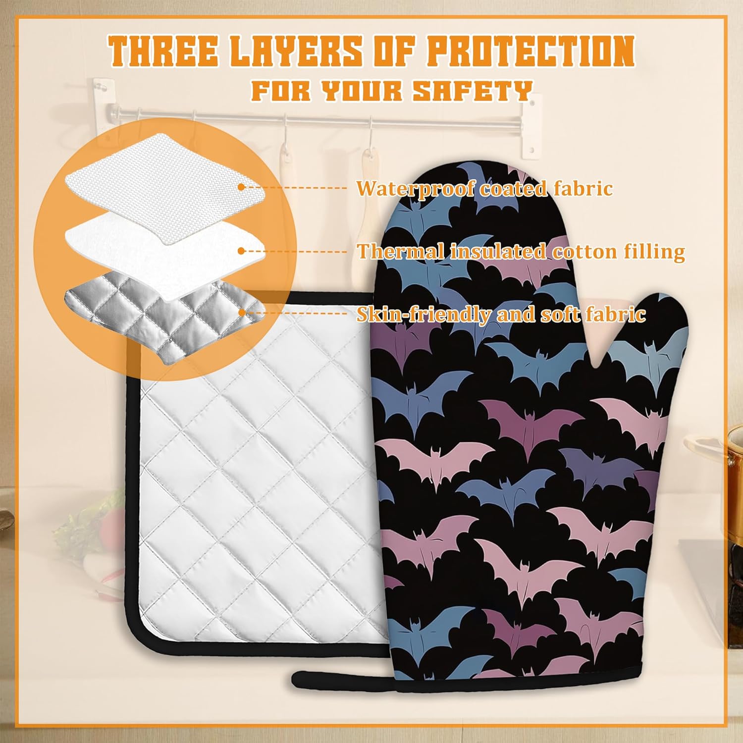 Colorful Bats Oven Mitts and Pot Holders Set,Kitchen Oven Gloves and Pot Holder with Heat Resistant Non Slip for Cooking Baking Grilling(4 Piece Set)