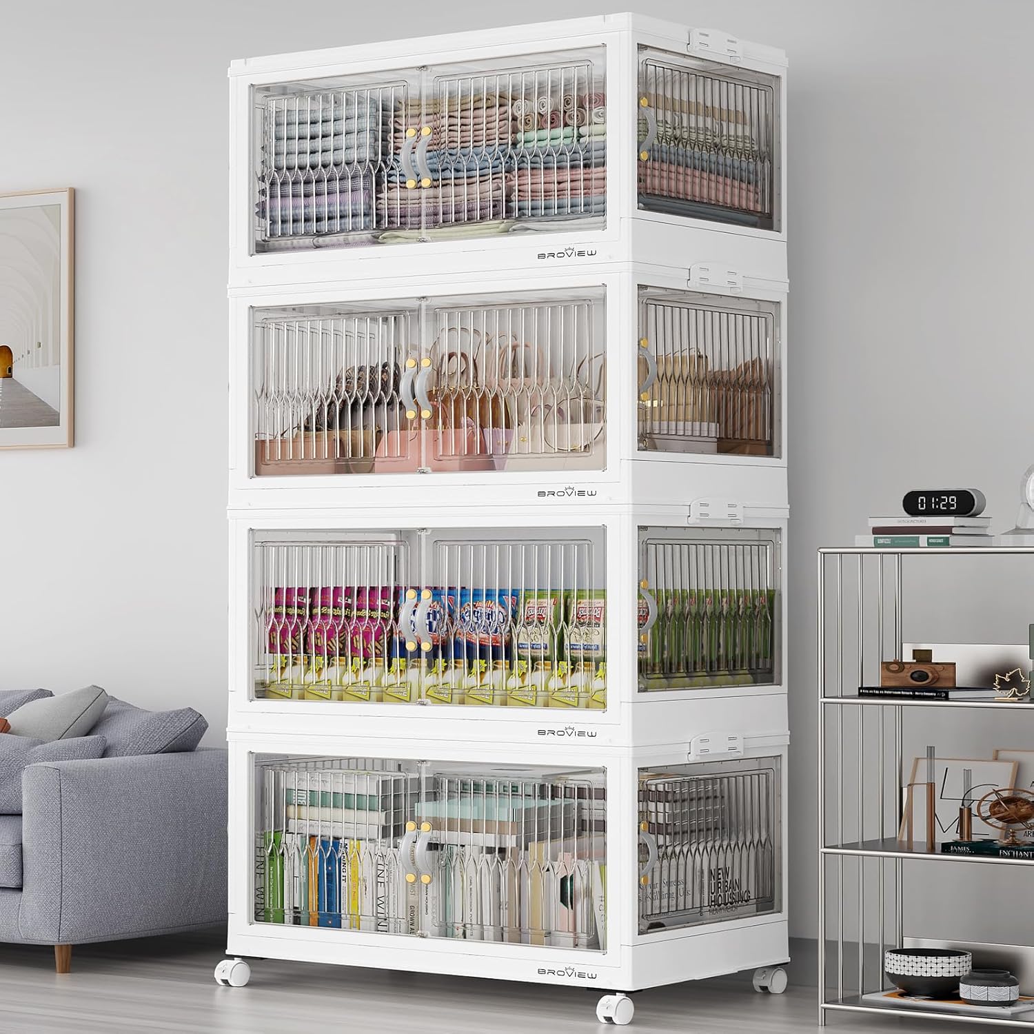 480QT Large Stackable Storage Bins with Lids, Plastic Closet Organizer and Storage Drawer, Collapsible Storage Box with Wheels, Folding Storage Cabinet with Doors for Home Kitchen, 4Pack White