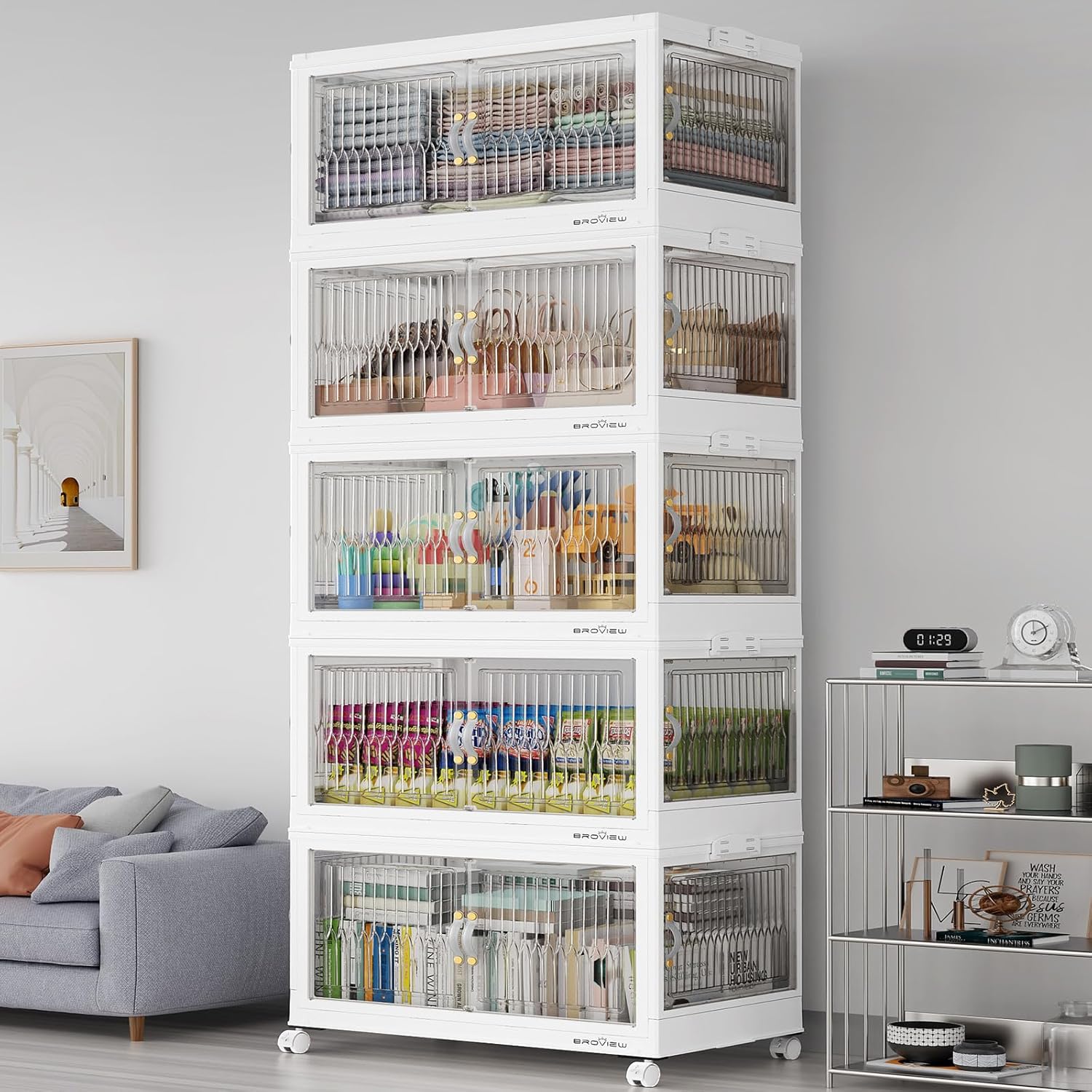 600QT Large Stackable Storage Bins with Lids, Plastic Closet Organizer and Storage Drawer, Collapsible Storage Box with Wheels, Folding Storage Cabinet with Doors for Home Kitchen, 5Pack White
