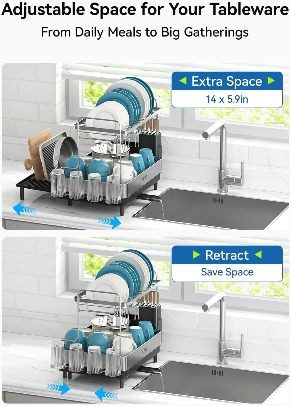 - [Expandable Design offers Extra Space 14*5.9’’]: The SUNLY expandable dish drying rack features a extendable multifunctional drainboard that offers an extra 14*5.9’’ of large capacity space, giving you the flexibility to maximize drying space when needed or keep it compact to save countertop space