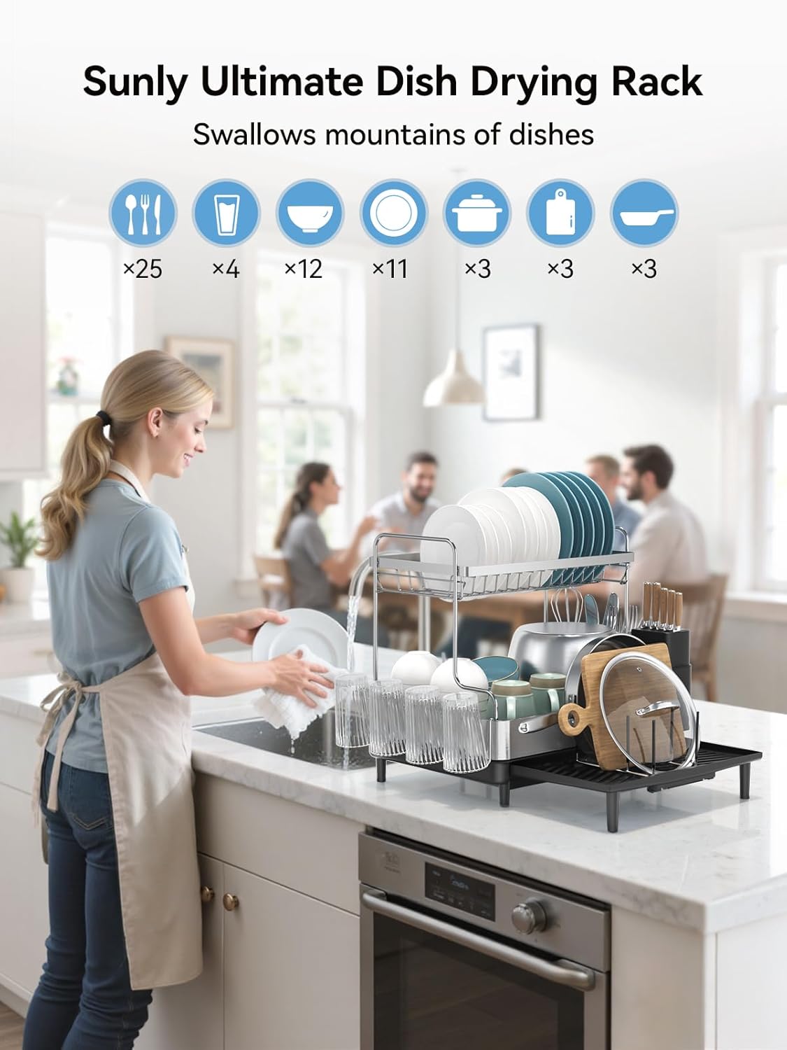 - [Multifunctional Dish Rack]: The Sunly dish rack features designated areas for plates, cups, bowls, pans & pots, wine glasses, utensils, and even dishwashing tools, keeping your kitchen essentials neatly organized