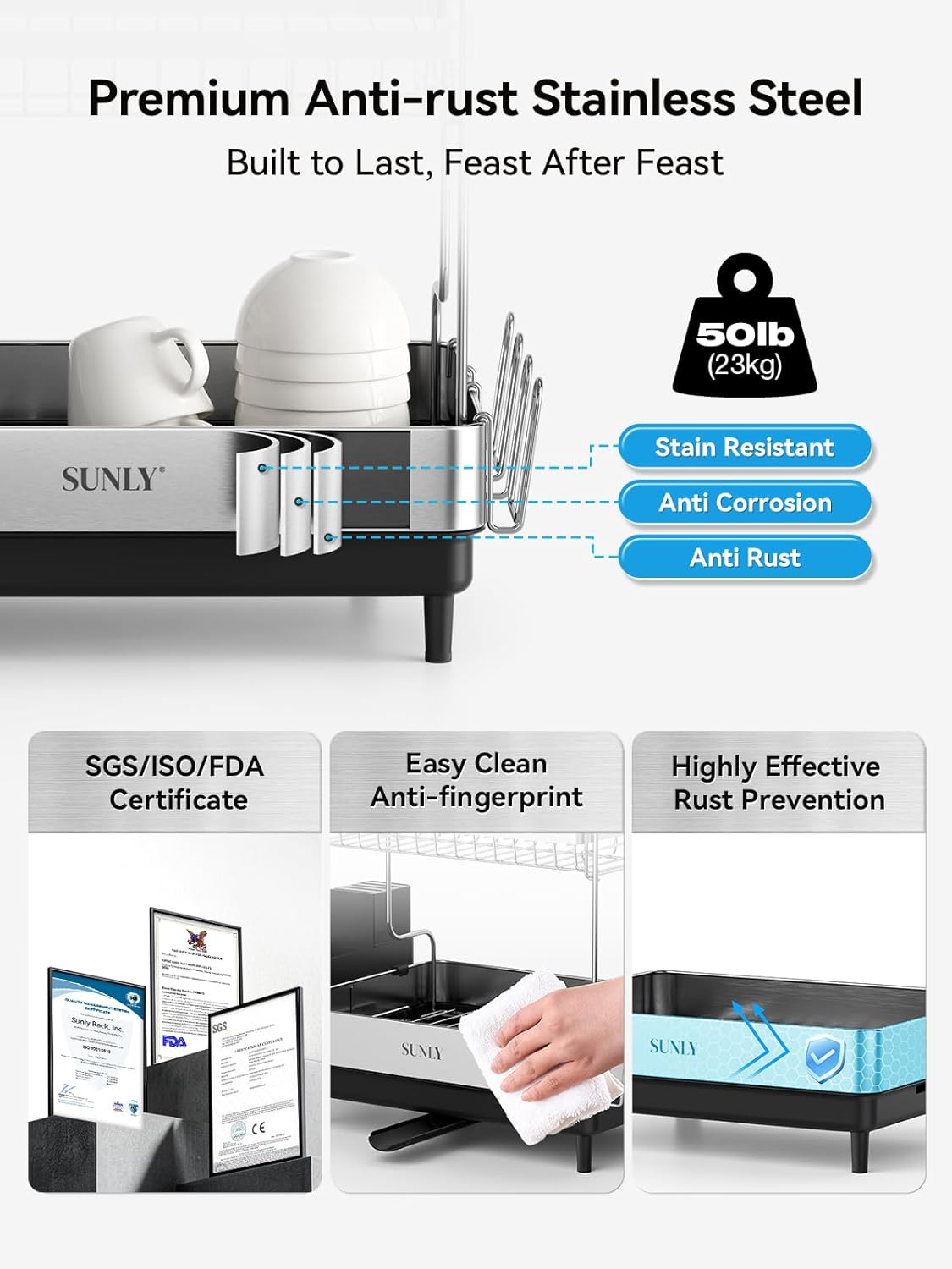 - [Larger Capacity & 2-Tier Design]: The Sunly Large 2-Tier Stainless Steel Dish Drying Rack measures 12.6”D x 22.48”W x 15.16”H, maximizing kitchen counter space for large families.