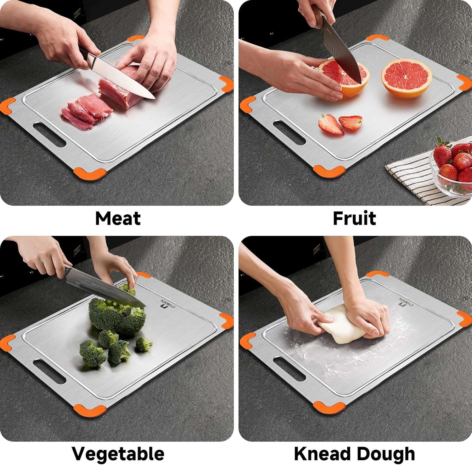 100% Pure Titanium Cutting Board with Grooves, Update Double Side Titanium Chopping Board, Silicone Anti-slip Stainless Cutting Boards for Kitchen 11 * 15 IN, Orange