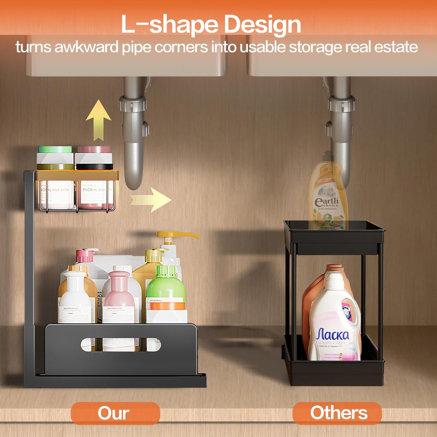 - 【L-Shaped Design】Tired of struggling with the cluttered space under your sink? This under sink organizer features a unique L-shaped design that skillfully works around pipes, freeing up more vertical space,provide more under sink storage. Just like a cabinet organizer focuses on efficient storage, ours leaves room for tall bottles—tackling that cabinet mess and keeping things neater and more organized.