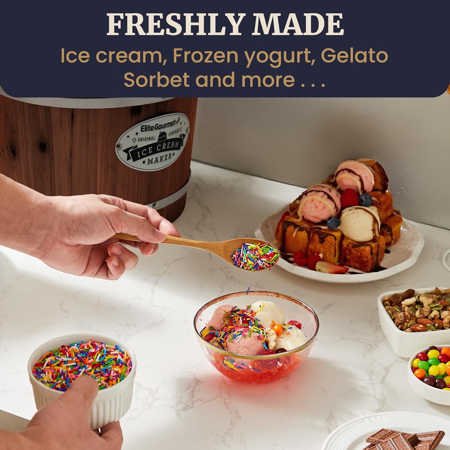 Elite Gourmet EIM949 Old Fashioned 6 Quart Vintage Walnut Wood Bucket, Electric Ice Cream Maker Machine Appalachian, Uses Ice and Rock Salt